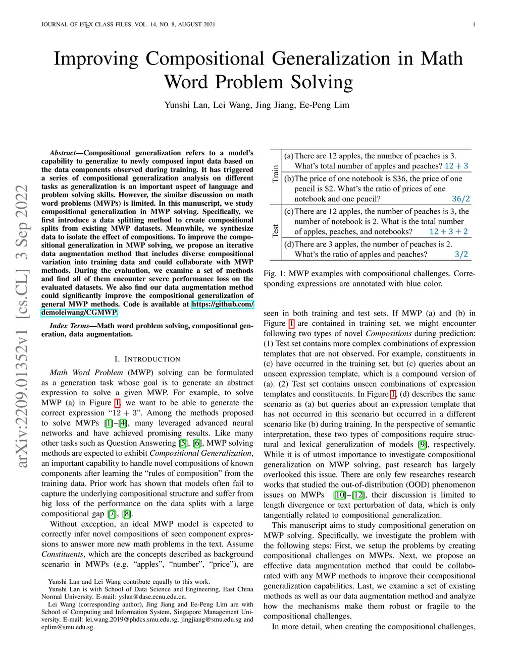 Compositional generalization refers to a model's capability to generalize to newly composed input data based on the data components observed during training. It has triggered a series of compositional generalization analysis on different tasks as generalization is an important aspect of language and problem solving skills. However, the similar discussion on math word problems (MWPs) is limited. In this manuscript, we study compositional generalization in MWP solving. Specifically, we first introduce a data splitting method to create compositional splits from existing MWP datasets. Meanwhile, we synthesize data to isolate the effect of compositions. To improve the compositional generalization in MWP solving, we propose an iterative data augmentation method that includes diverse compositional variation into training data and could collaborate with MWP methods. During the evaluation, we examine a set of methods and find all of them encounter severe performance loss on the evaluated datasets. We also find our data augmentation method could significantly improve the compositional generalization of general MWP methods. Code is available at https://github.com/demoleiwang/CGMWP.