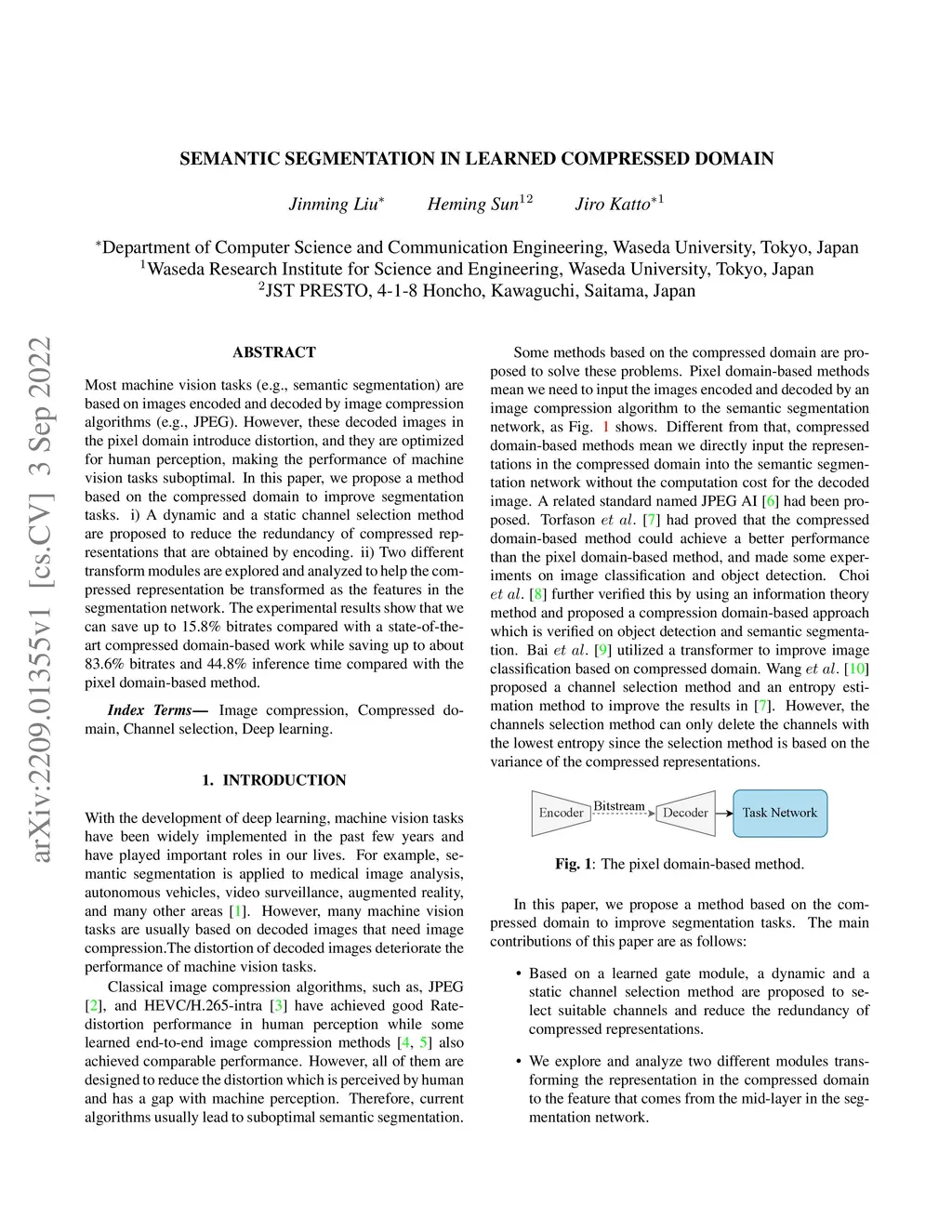 Most machine vision tasks (e.g., semantic segmentation) are based on images encoded and decoded by image compression algorithms (e.g., JPEG). However, these decoded images in the pixel domain introduce distortion, and they are optimized for human perception, making the performance of machine vision tasks suboptimal. In this paper, we propose a method based on the compressed domain to improve segmentation tasks. i) A dynamic and a static channel selection method are proposed to reduce the redundancy of compressed representations that are obtained by encoding. ii) Two different transform modules are explored and analyzed to help the compressed representation be transformed as the features in the segmentation network. The experimental results show that we can save up to 15.8\% bitrates compared with a state-of-the-art compressed domain-based work while saving up to about 83.6\% bitrates and 44.8\% inference time compared with the pixel domain-based method.