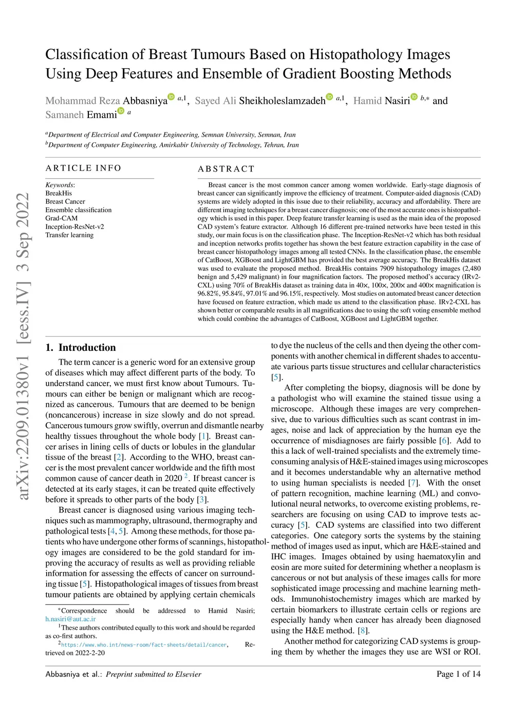 Breast cancer is the most common cancer among women worldwide. Early-stage diagnosis of breast cancer can significantly improve the efficiency of treatment. Computer-aided diagnosis (CAD) systems are widely adopted in this issue due to their reliability, accuracy and affordability. There are different imaging techniques for a breast cancer diagnosis; one of the most accurate ones is histopathology which is used in this paper. Deep feature transfer learning is used as the main idea of the proposed CAD system's feature extractor. Although 16 different pre-trained networks have been tested in this study, our main focus is on the classification phase. The Inception-ResNet-v2 which has both residual and inception networks profits together has shown the best feature extraction capability in the case of breast cancer histopathology images among all tested CNNs. In the classification phase, the ensemble of CatBoost, XGBoost and LightGBM has provided the best average accuracy. The BreakHis dataset was used to evaluate the proposed method. BreakHis contains 7909 histopathology images (2,480 benign and 5,429 malignant) in four magnification factors. The proposed method's accuracy (IRv2-CXL) using 70% of BreakHis dataset as training data in 40x, 100x, 200x and 400x magnification is 96.82%, 95.84%, 97.01% and 96.15%, respectively. Most studies on automated breast cancer detection have focused on feature extraction, which made us attend to the classification phase. IRv2-CXL has shown better or comparable results in all magnifications due to using the soft voting ensemble method which could combine the advantages of CatBoost, XGBoost and LightGBM together.