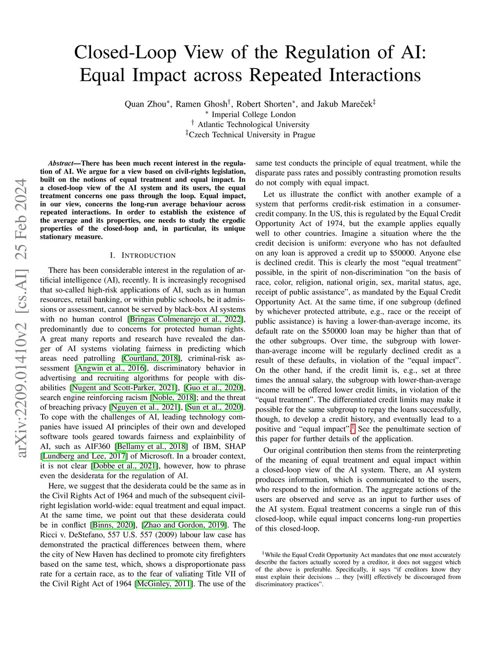There has been much recent interest in the regulation of AI. We argue for a view based on civil-rights legislation, built on the notions of equal treatment and equal impact. In a closed-loop view of the AI system and its users, the equal treatment concerns one pass through the loop. Equal impact, in our view, concerns the long-run average behaviour across repeated interactions. In order to establish the existence of the average and its properties, one needs to study the ergodic properties of the closed-loop and its unique stationary measure.