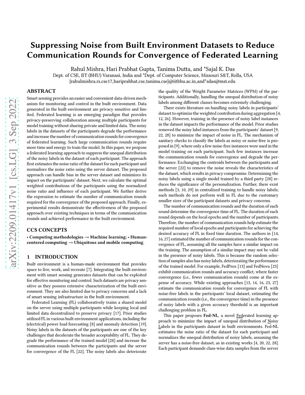 Smart sensing provides an easier and convenient data-driven mechanism for monitoring and control in the built environment. Data generated in the built environment are privacy sensitive and limited. Federated learning is an emerging paradigm that provides privacy-preserving collaboration among multiple participants for model training without sharing private and limited data. The noisy labels in the datasets of the participants degrade the performance and increase the number of communication rounds for convergence of federated learning. Such large communication rounds require more time and energy to train the model. In this paper, we propose a federated learning approach to suppress the unequal distribution of the noisy labels in the dataset of each participant. The approach first estimates the noise ratio of the dataset for each participant and normalizes the noise ratio using the server dataset. The proposed approach can handle bias in the server dataset and minimizes its impact on the participants' dataset. Next, we calculate the optimal weighted contributions of the participants using the normalized noise ratio and influence of each participant. We further derive the expression to estimate the number of communication rounds required for the convergence of the proposed approach. Finally, experimental results demonstrate the effectiveness of the proposed approach over existing techniques in terms of the communication rounds and achieved performance in the built environment.