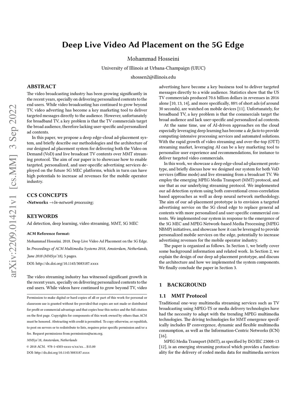 The video broadcasting industry has been growing significantly in the recent years, specially on delivering personalized contents to the end users. While video broadcasting has continued to grow beyond TV, video adverting has become a key marketing tool to deliver targeted messages directly to the audience. However, unfortunately for broadband TV, a key problem is that the TV commercials target the broad audience, therefore lacking user-specific and personalized ad contents. In this paper, we propose a deep edge-cloud ad-placement system, and briefly describe our methodologies and the architecture of our designed ad placement system for delivering both the Video on Demand (VoD) and live broadcast TV contents over MMT streaming protocol. The aim of our paper is to showcase how to enable targeted, personalized, and user-specific advertising services deployed on the future 5G MEC platforms, which in turn can have high potentials to increase ad revenues for the mobile operator industry.