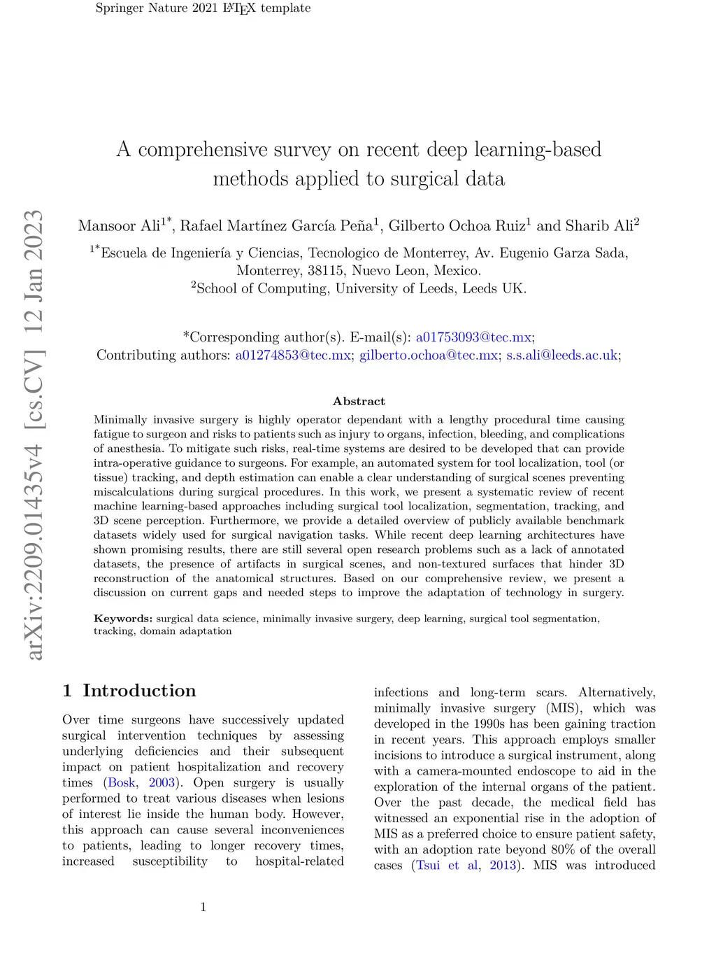 Minimally invasive surgery is highly operator dependant with a lengthy procedural time causing fatigue to surgeon and risks to patients such as injury to organs, infection, bleeding, and complications of anesthesia. To mitigate such risks, real-time systems are desired to be developed that can provide intra-operative guidance to surgeons. For example, an automated system for tool localization, tool (or tissue) tracking, and depth estimation can enable a clear understanding of surgical scenes preventing miscalculations during surgical procedures. In this work, we present a systematic review of recent machine learning-based approaches including surgical tool localization, segmentation, tracking, and 3D scene perception. Furthermore, we provide a detailed overview of publicly available benchmark datasets widely used for surgical navigation tasks. While recent deep learning architectures have shown promising results, there are still several open research problems such as a lack of annotated datasets, the presence of artifacts in surgical scenes, and non-textured surfaces that hinder 3D reconstruction of the anatomical structures. Based on our comprehensive review, we present a discussion on current gaps and needed steps to improve the adaptation of technology in surgery.