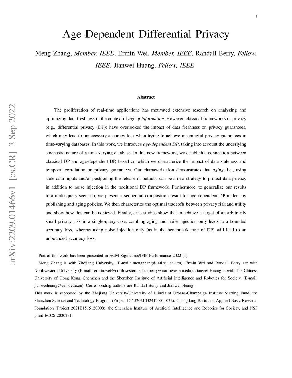 The proliferation of real-time applications has motivated extensive research on analyzing and optimizing data freshness in the context of \textit{age of information}. However, classical frameworks of privacy (e.g., differential privacy (DP)) have overlooked the impact of data freshness on privacy guarantees, which may lead to unnecessary accuracy loss when trying to achieve meaningful privacy guarantees in time-varying databases. In this work, we introduce \textit{age-dependent DP}, taking into account the underlying stochastic nature of a time-varying database. In this new framework, we establish a connection between classical DP and age-dependent DP, based on which we characterize the impact of data staleness and temporal correlation on privacy guarantees. Our characterization demonstrates that \textit{aging}, i.e., using stale data inputs and/or postponing the release of outputs, can be a new strategy to protect data privacy in addition to noise injection in the traditional DP framework. Furthermore, to generalize our results to a multi-query scenario, we present a sequential composition result for age-dependent DP under any publishing and aging policies. We then characterize the optimal tradeoffs between privacy risk and utility and show how this can be achieved. Finally, case studies show that to achieve a target of an arbitrarily small privacy risk in a single-query case, combing aging and noise injection only leads to a bounded accuracy loss, whereas using noise injection only (as in the benchmark case of DP) will lead to an unbounded accuracy loss.