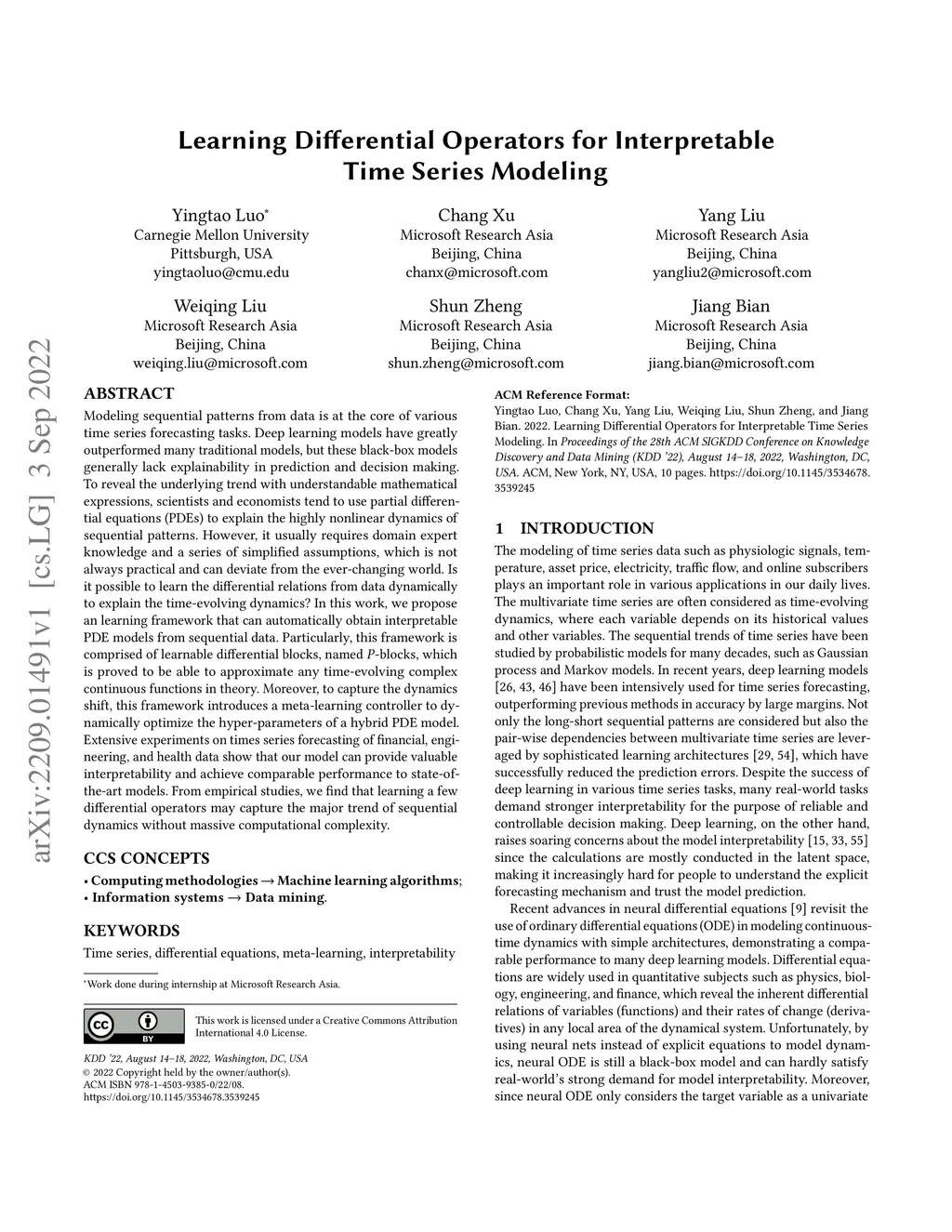 Modeling sequential patterns from data is at the core of various time series forecasting tasks. Deep learning models have greatly outperformed many traditional models, but these black-box models generally lack explainability in prediction and decision making. To reveal the underlying trend with understandable mathematical expressions, scientists and economists tend to use partial differential equations (PDEs) to explain the highly nonlinear dynamics of sequential patterns. However, it usually requires domain expert knowledge and a series of simplified assumptions, which is not always practical and can deviate from the ever-changing world. Is it possible to learn the differential relations from data dynamically to explain the time-evolving dynamics? In this work, we propose an learning framework that can automatically obtain interpretable PDE models from sequential data. Particularly, this framework is comprised of learnable differential blocks, named -blocks, which is proved to be able to approximate any time-evolving complex continuous functions in theory. Moreover, to capture the dynamics shift, this framework introduces a meta-learning controller to dynamically optimize the hyper-parameters of a hybrid PDE model. Extensive experiments on times series forecasting of financial, engineering, and health data show that our model can provide valuable interpretability and achieve comparable performance to state-of-the-art models. From empirical studies, we find that learning a few differential operators may capture the major trend of sequential dynamics without massive computational complexity.