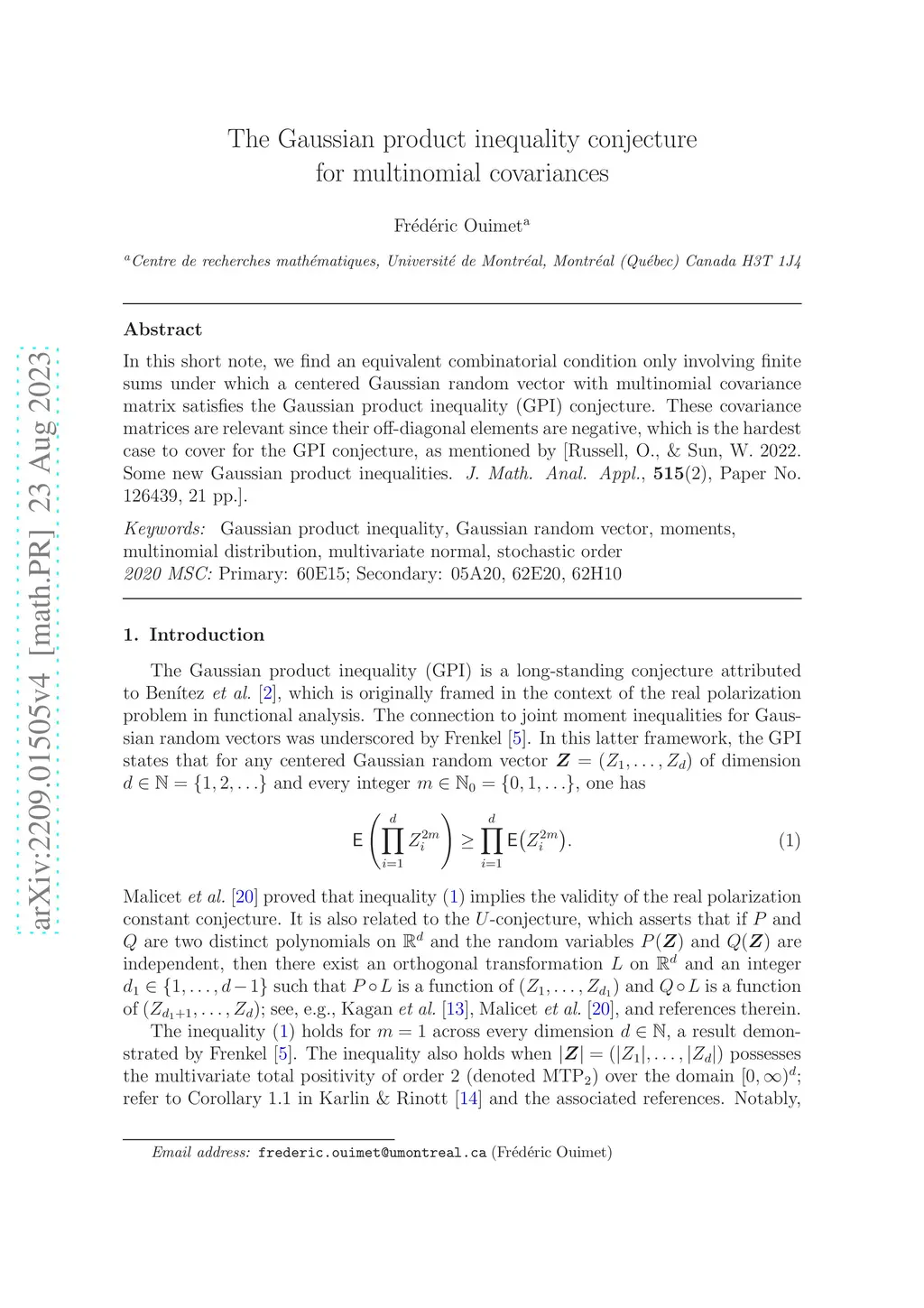 In this short note, we find an equivalent combinatorial condition only involving finite sums under which a centered Gaussian random vector with multinomial covariance matrix satisfies the Gaussian product inequality (GPI) conjecture. These covariance matrices are relevant since their off-diagonal elements are negative, which is the hardest case to cover for the GPI conjecture, as mentioned by [Russell, O., \& Sun, W. 2022. Some new {G}aussian product inequalities. {\em J. Math. Anal. Appl.}, {\bf 515}(2), Paper No. 126439, 21 pp.].