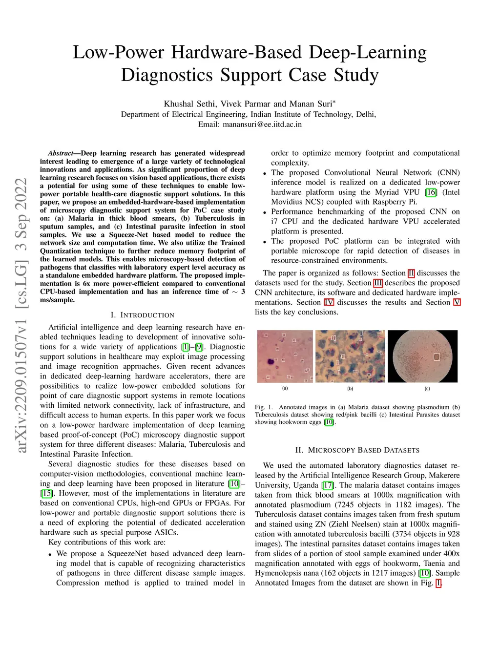Deep learning research has generated widespread interest leading to emergence of a large variety of technological innovations and applications. As significant proportion of deep learning research focuses on vision based applications, there exists a potential for using some of these techniques to enable low-power portable health-care diagnostic support solutions. In this paper, we propose an embedded-hardware-based implementation of microscopy diagnostic support system for PoC case study on: (a) Malaria in thick blood smears, (b) Tuberculosis in sputum samples, and (c) Intestinal parasite infection in stool samples. We use a Squeeze-Net based model to reduce the network size and computation time. We also utilize the Trained Quantization technique to further reduce memory footprint of the learned models. This enables microscopy-based detection of pathogens that classifies with laboratory expert level accuracy as a standalone embedded hardware platform. The proposed implementation is 6x more power-efficient compared to conventional CPU-based implementation and has an inference time of 3 ms/sample.