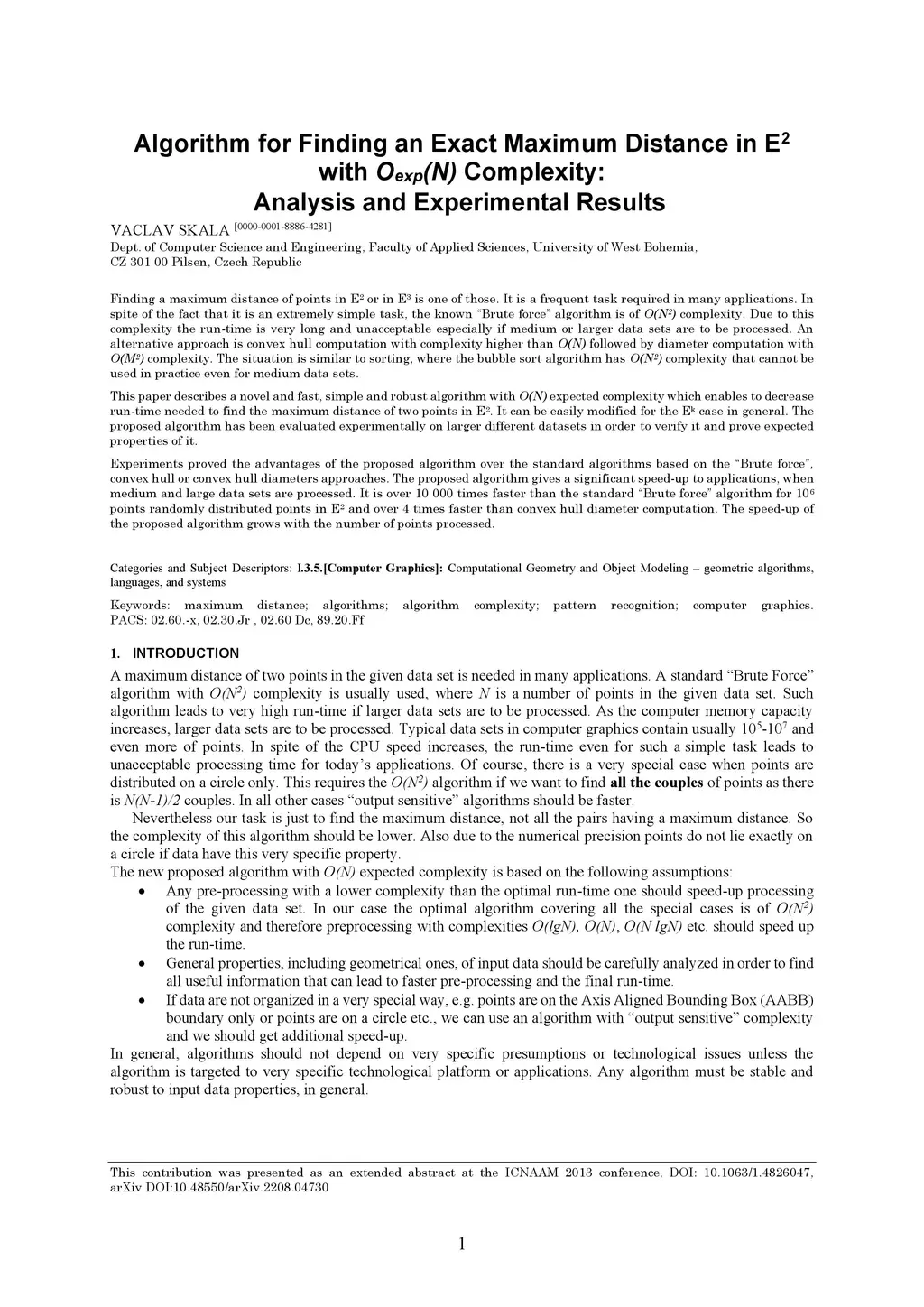 This paper describes a novel and fast, simple and robust algorithm with O(N) expected complexity which enables to decrease run time needed to find the maximum distance of two points in E2. It can be easily modified for the E3 case in general. The proposed algorithm has been evaluated experimentally on larger different datasets in order to verify it and prove expected properties of it. Experiments proved the advantages of the proposed algorithm over the standard algorithms based on the Brute force, convex hull or convex hull diameters approaches. The proposed algorithm gives a significant speed-up to applications, when medium and large data sets are processed. It is over 10 000 times faster than the standard Brute force algorithm for 10 mil. points randomly distributed points in E2 and over 4 times faster than convex hull diameter computation. The speed-up of the proposed algorithm grows with the number of points processed.