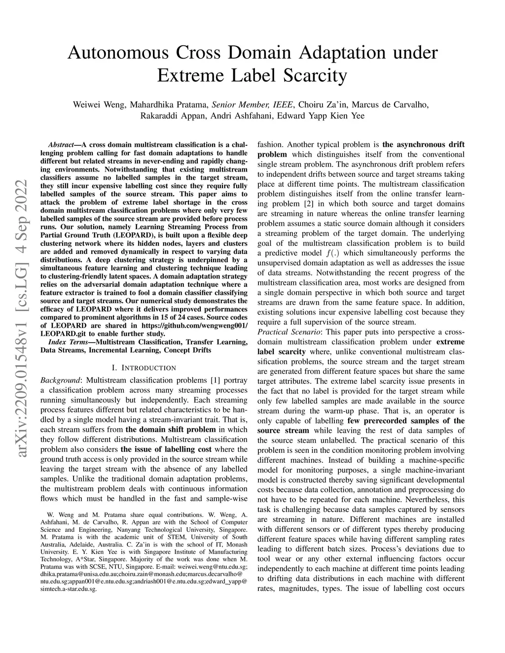 A cross domain multistream classification is a challenging problem calling for fast domain adaptations to handle different but related streams in never-ending and rapidly changing environments. Notwithstanding that existing multistream classifiers assume no labelled samples in the target stream, they still incur expensive labelling cost since they require fully labelled samples of the source stream. This paper aims to attack the problem of extreme label shortage in the cross domain multistream classification problems where only very few labelled samples of the source stream are provided before process runs. Our solution, namely Learning Streaming Process from Partial Ground Truth (LEOPARD), is built upon a flexible deep clustering network where its hidden nodes, layers and clusters are added and removed dynamically in respect to varying data distributions. A deep clustering strategy is underpinned by a simultaneous feature learning and clustering technique leading to clustering-friendly latent spaces. A domain adaptation strategy relies on the adversarial domain adaptation technique where a feature extractor is trained to fool a domain classifier classifying source and target streams. Our numerical study demonstrates the efficacy of LEOPARD where it delivers improved performances compared to prominent algorithms in 15 of 24 cases. Source codes of LEOPARD are shared in \url{https://github.com/wengweng001/LEOPARD.git} to enable further study.