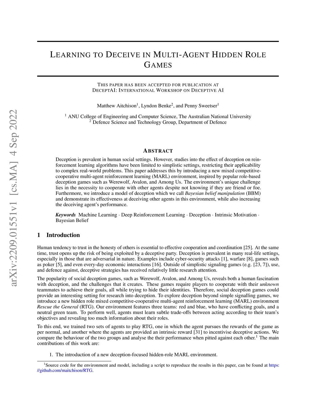 Deception is prevalent in human social settings. However, studies into the effect of deception on reinforcement learning algorithms have been limited to simplistic settings, restricting their applicability to complex real-world problems. This paper addresses this by introducing a new mixed competitive-cooperative multi-agent reinforcement learning (MARL) environment inspired by popular role-based deception games such as Werewolf, Avalon, and Among Us. The environment's unique challenge lies in the necessity to cooperate with other agents despite not knowing if they are friend or foe. Furthermore, we introduce a model of deception, which we call Bayesian belief manipulation (BBM) and demonstrate its effectiveness at deceiving other agents in this environment while also increasing the deceiving agent's performance.