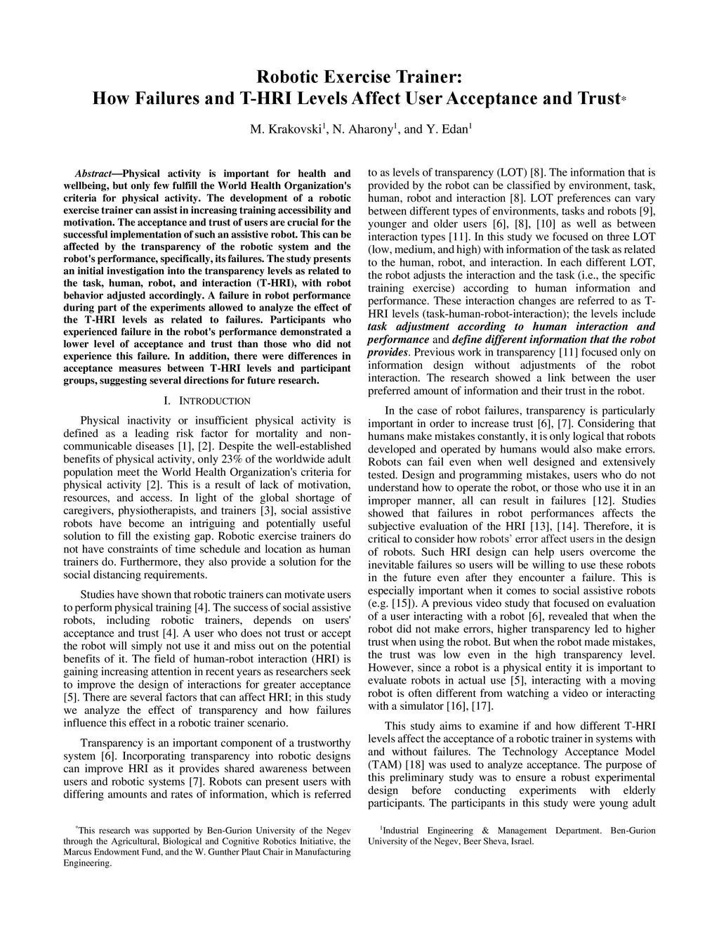 Robotic Exercise Trainer: How Failures and T-HRI Levels Affect User