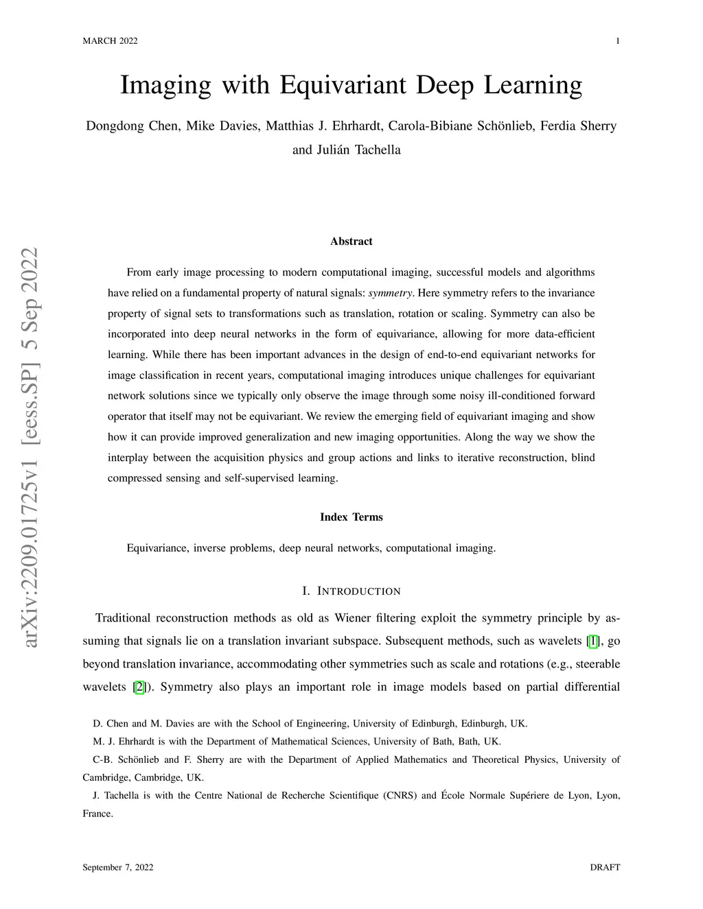 From early image processing to modern computational imaging, successful models and algorithms have relied on a fundamental property of natural signals: symmetry. Here symmetry refers to the invariance property of signal sets to transformations such as translation, rotation or scaling. Symmetry can also be incorporated into deep neural networks in the form of equivariance, allowing for more data-efficient learning. While there has been important advances in the design of end-to-end equivariant networks for image classification in recent years, computational imaging introduces unique challenges for equivariant network solutions since we typically only observe the image through some noisy ill-conditioned forward operator that itself may not be equivariant. We review the emerging field of equivariant imaging and show how it can provide improved generalization and new imaging opportunities. Along the way we show the interplay between the acquisition physics and group actions and links to iterative reconstruction, blind compressed sensing and self-supervised learning.