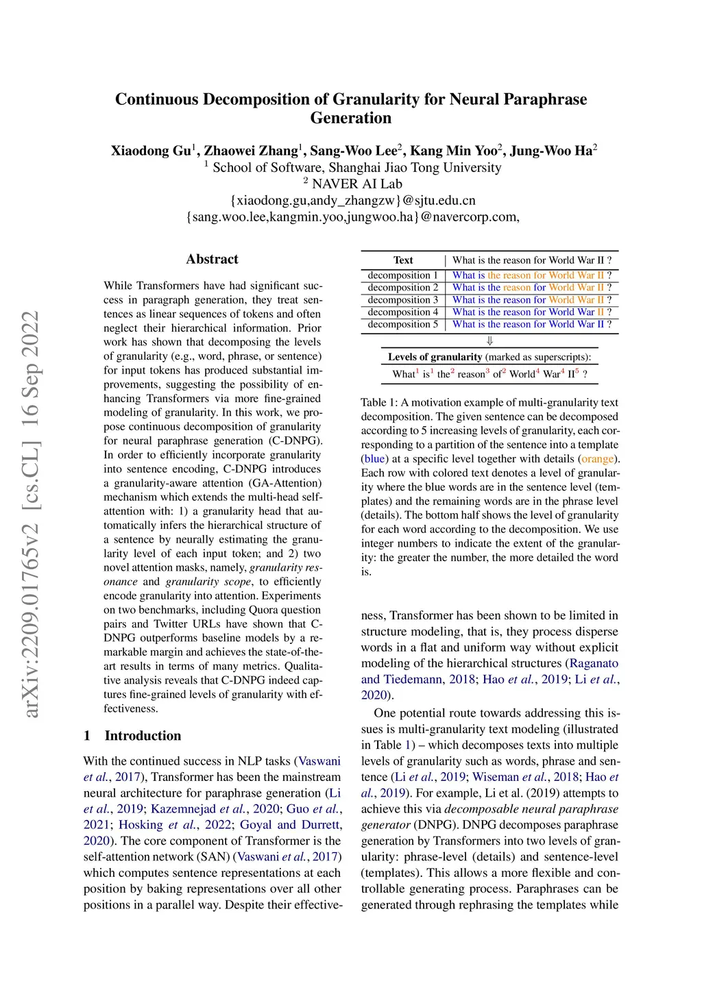Continuous Decomposition of Granularity for Neural Paraphrase Generation