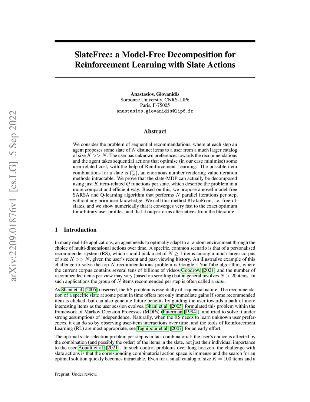 We consider the problem of sequential recommendations, where at each step an agent proposes some slate of distinct items to a user from a much larger catalog of size . The user has unknown preferences towards the recommendations and the agent takes sequential actions that optimise (in our case minimise) some user-related cost, with the help of Reinforcement Learning. The possible item combinations for a slate is , an enormous number rendering value iteration methods intractable. We prove that the slate-MDP can actually be decomposed using just item-related functions per state, which describe the problem in a more compact and efficient way. Based on this, we propose a novel model-free SARSA and Q-learning algorithm that performs parallel iterations per step, without any prior user knowledge. We call this method \texttt{SlateFree}, i.e. free-of-slates, and we show numerically that it converges very fast to the exact optimum for arbitrary user profiles, and that it outperforms alternatives from the literature.
