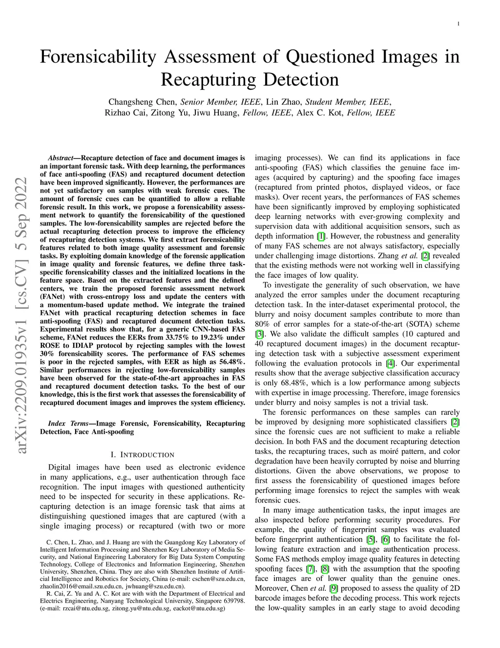 Recapture detection of face and document images is an important forensic task. With deep learning, the performances of face anti-spoofing (FAS) and recaptured document detection have been improved significantly. However, the performances are not yet satisfactory on samples with weak forensic cues. The amount of forensic cues can be quantified to allow a reliable forensic result. In this work, we propose a forensicability assessment network to quantify the forensicability of the questioned samples. The low-forensicability samples are rejected before the actual recapturing detection process to improve the efficiency of recapturing detection systems. We first extract forensicability features related to both image quality assessment and forensic tasks. By exploiting domain knowledge of the forensic application in image quality and forensic features, we define three task-specific forensicability classes and the initialized locations in the feature space. Based on the extracted features and the defined centers, we train the proposed forensic assessment network (FANet) with cross-entropy loss and update the centers with a momentum-based update method. We integrate the trained FANet with practical recapturing detection schemes in face anti-spoofing and recaptured document detection tasks. Experimental results show that, for a generic CNN-based FAS scheme, FANet reduces the EERs from 33.75% to 19.23% under ROSE to IDIAP protocol by rejecting samples with the lowest 30% forensicability scores. The performance of FAS schemes is poor in the rejected samples, with EER as high as 56.48%. Similar performances in rejecting low-forensicability samples have been observed for the state-of-the-art approaches in FAS and recaptured document detection tasks. To the best of our knowledge, this is the first work that assesses the forensicability of recaptured document images and improves the system efficiency.