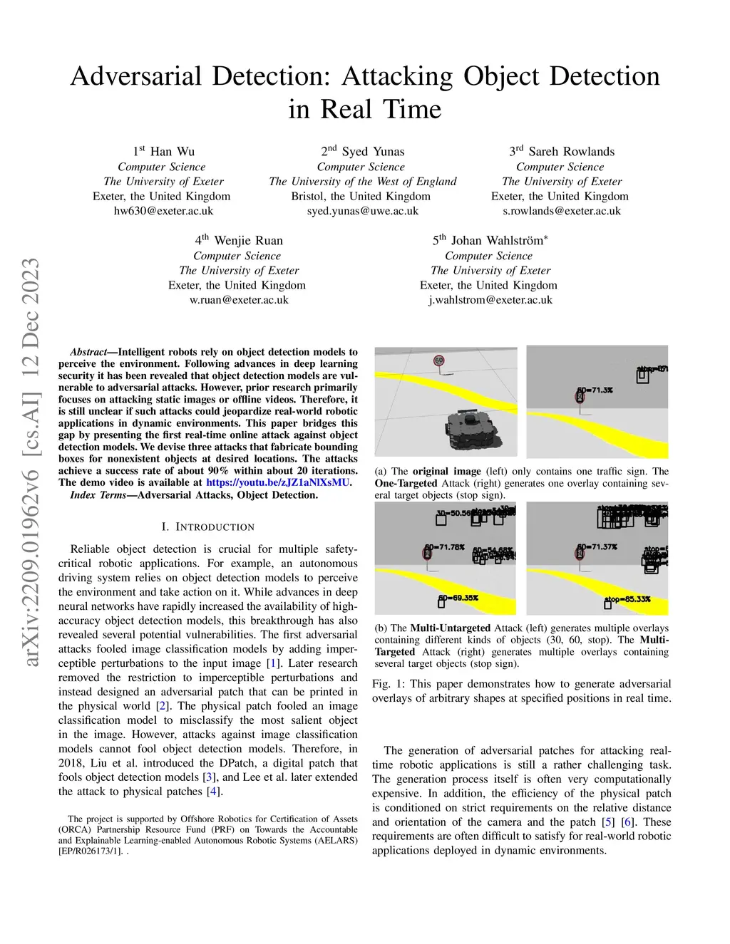 Intelligent robots rely on object detection models to perceive the environment. Following advances in deep learning security it has been revealed that object detection models are vulnerable to adversarial attacks. However, prior research primarily focuses on attacking static images or offline videos. Therefore, it is still unclear if such attacks could jeopardize real-world robotic applications in dynamic environments. This paper bridges this gap by presenting the first real-time online attack against object detection models. We devise three attacks that fabricate bounding boxes for nonexistent objects at desired locations. The attacks achieve a success rate of about 90% within about 20 iterations. The demo video is available at https://youtu.be/zJZ1aNlXsMU.
