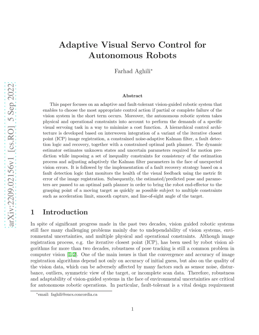 This paper focuses on an adaptive and fault-tolerant vision-guided robotic system that enables to choose the most appropriate control action if partial or complete failure of the vision system in the short term occurs. Moreover, the autonomous robotic system takes physical and operational constraints into account to perform the demands of a specific visual servoing task in a way to minimize a cost function. A hierarchical control architecture is developed based on interwoven integration of a variant of the iterative closest point (ICP) image registration, a constrained noise-adaptive Kalman filter, a fault detection logic and recovery, together with a constrained optimal path planner. The dynamic estimator estimates unknown states and uncertain parameters required for motion prediction while imposing a set of inequality constraints for consistency of the estimation process and adjusting adaptively the Kalman filter parameters in the face of unexpected vision errors. It is followed by the implementation of a fault recovery strategy based on a fault detection logic that monitors the health of the visual feedback using the metric fit error of the image registration. Subsequently, the estimated/predicted pose and parameters are passed to an optimal path planner in order to bring the robot end-effector to the grasping point of a moving target as quickly as possible subject to multiple constraints such as acceleration limit, smooth capture, and line-of-sight angle of the target.