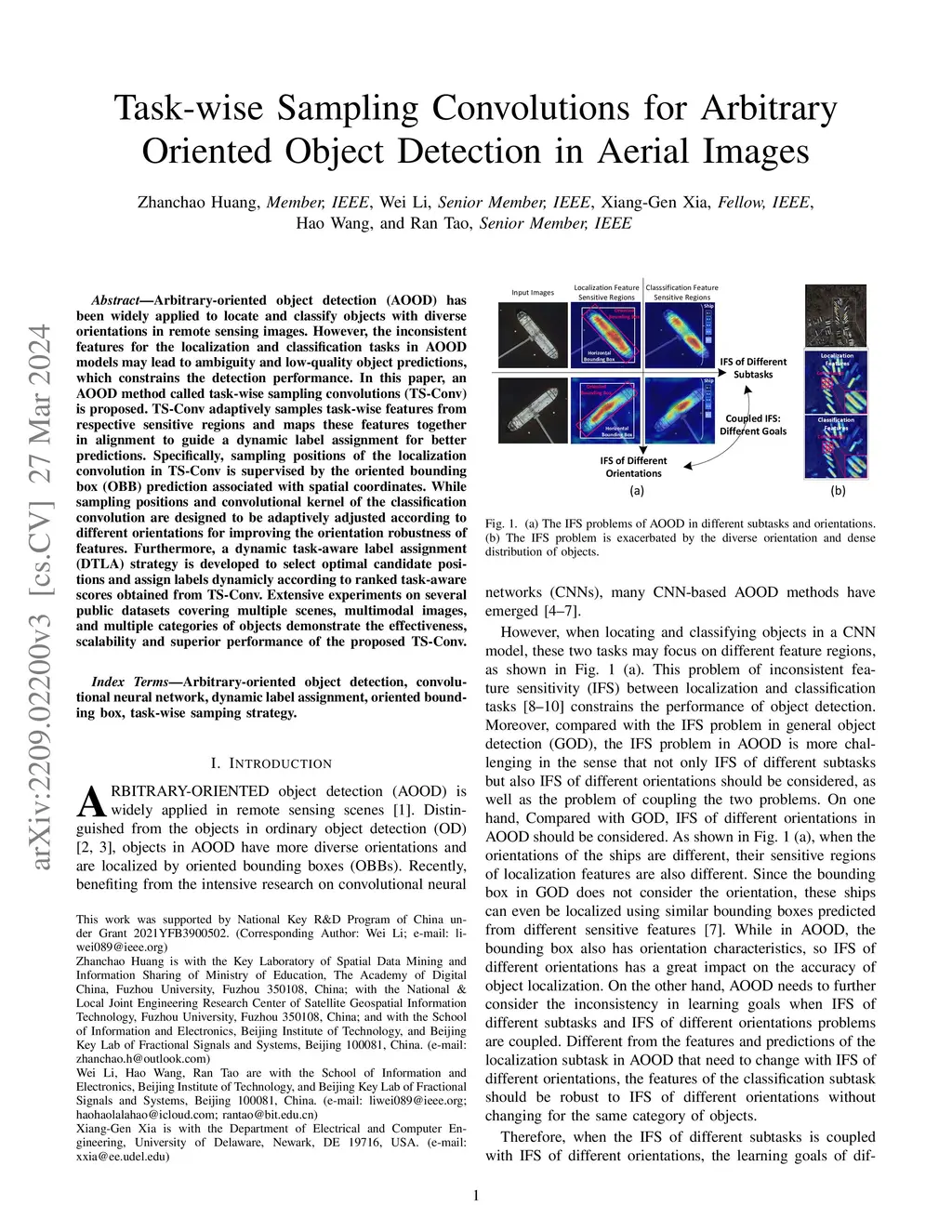 Arbitrary-oriented object detection (AOOD) has been widely applied to locate and classify objects with diverse orientations in remote sensing images. However, the inconsistent features for the localization and classification tasks in AOOD models may lead to ambiguity and low-quality object predictions, which constrains the detection performance. In this article, an AOOD method called task-wise sampling convolutions (TS-Conv) is proposed. TS-Conv adaptively samples task-wise features from respective sensitive regions and maps these features together in alignment to guide a dynamic label assignment for better predictions. Specifically, sampling positions of the localization convolution in TS-Conv are supervised by the oriented bounding box (OBB) prediction associated with spatial coordinates, while sampling positions and convolutional kernel of the classification convolution are designed to be adaptively adjusted according to different orientations for improving the orientation robustness of features. Furthermore, a dynamic task-consistent-aware label assignment (DTLA) strategy is developed to select optimal candidate positions and assign labels dynamically according to ranked task-aware scores obtained from TS-Conv. Extensive experiments on several public datasets covering multiple scenes, multimodal images, and multiple categories of objects demonstrate the effectiveness, scalability, and superior performance of the proposed TS-Conv.