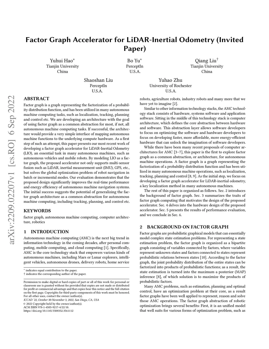 Factor graph is a graph representing the factorization of a probability distribution function, and has been utilized in many autonomous machine computing tasks, such as localization, tracking, planning and control etc. We are developing an architecture with the goal of using factor graph as a common abstraction for most, if not, all autonomous machine computing tasks. If successful, the architecture would provide a very simple interface of mapping autonomous machine functions to the underlying compute hardware. As a first step of such an attempt, this paper presents our most recent work of developing a factor graph accelerator for LiDAR-Inertial Odometry (LIO), an essential task in many autonomous machines, such as autonomous vehicles and mobile robots. By modeling LIO as a factor graph, the proposed accelerator not only supports multi-sensor fusion such as LiDAR, inertial measurement unit (IMU), GPS, etc., but solves the global optimization problem of robot navigation in batch or incremental modes. Our evaluation demonstrates that the proposed design significantly improves the real-time performance and energy efficiency of autonomous machine navigation systems. The initial success suggests the potential of generalizing the factor graph architecture as a common abstraction for autonomous machine computing, including tracking, planning, and control etc.
