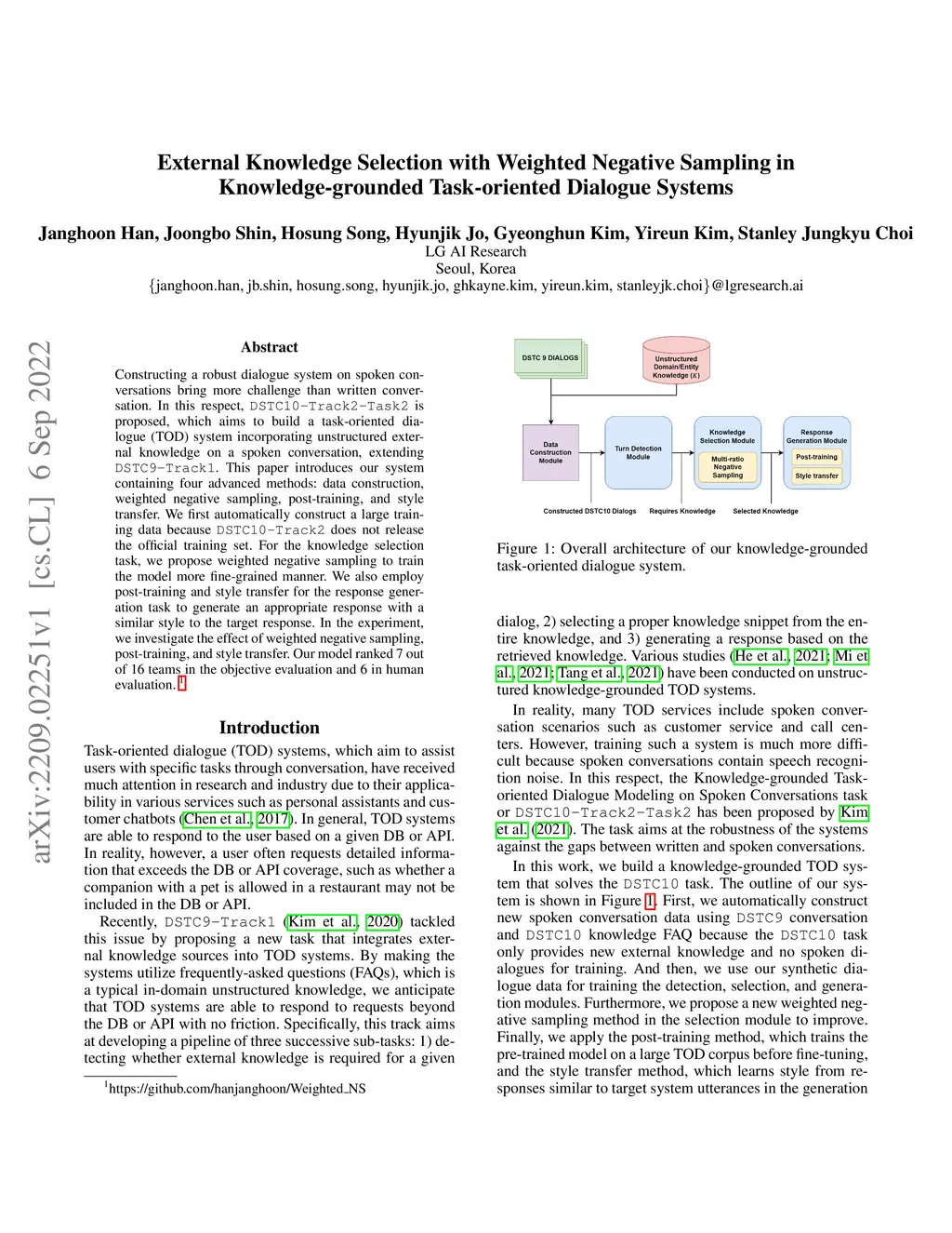 Constructing a robust dialogue system on spoken conversations bring more challenge than written conversation. In this respect, DSTC10-Track2-Task2 is proposed, which aims to build a task-oriented dialogue (TOD) system incorporating unstructured external knowledge on a spoken conversation, extending DSTC9-Track1. This paper introduces our system containing four advanced methods: data construction, weighted negative sampling, post-training, and style transfer. We first automatically construct a large training data because DSTC10-Track2 does not release the official training set. For the knowledge selection task, we propose weighted negative sampling to train the model more fine-grained manner. We also employ post-training and style transfer for the response generation task to generate an appropriate response with a similar style to the target response. In the experiment, we investigate the effect of weighted negative sampling, post-training, and style transfer. Our model ranked 7 out of 16 teams in the objective evaluation and 6 in human evaluation.