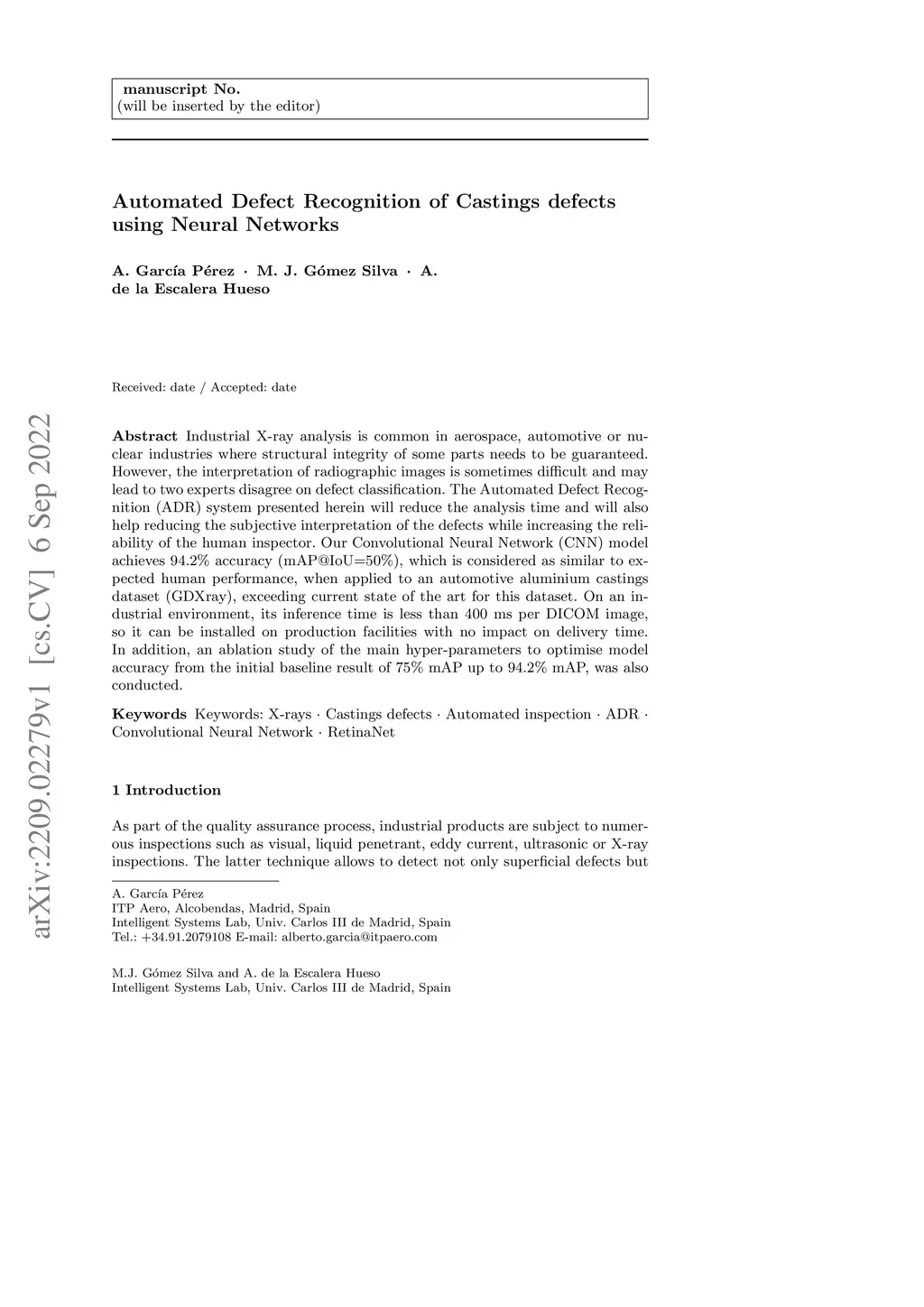Industrial X-ray analysis is common in aerospace, automotive or nuclear industries where structural integrity of some parts needs to be guaranteed. However, the interpretation of radiographic images is sometimes difficult and may lead to two experts disagree on defect classification. The Automated Defect Recognition (ADR) system presented herein will reduce the analysis time and will also help reducing the subjective interpretation of the defects while increasing the reliability of the human inspector. Our Convolutional Neural Network (CNN) model achieves 94.2\% accuracy (mAP@IoU=50\%), which is considered as similar to expected human performance, when applied to an automotive aluminium castings dataset (GDXray), exceeding current state of the art for this dataset. On an industrial environment, its inference time is less than 400 ms per DICOM image, so it can be installed on production facilities with no impact on delivery time. In addition, an ablation study of the main hyper-parameters to optimise model accuracy from the initial baseline result of 75\% mAP up to 94.2\% mAP, was also conducted.