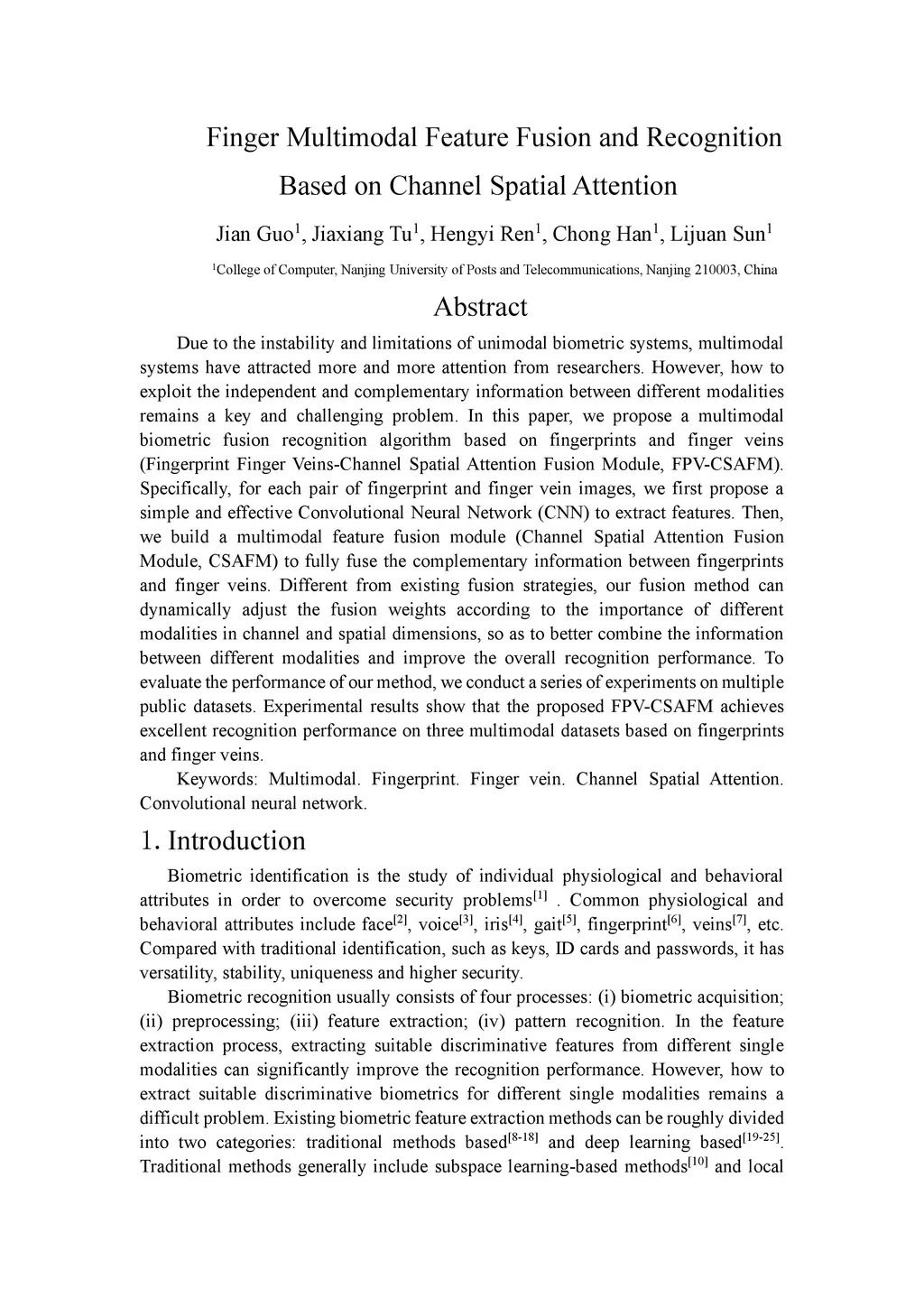 Due to the instability and limitations of unimodal biometric systems, multimodal systems have attracted more and more attention from researchers. However, how to exploit the independent and complementary information between different modalities remains a key and challenging problem. In this paper, we propose a multimodal biometric fusion recognition algorithm based on fingerprints and finger veins (Fingerprint Finger Veins-Channel Spatial Attention Fusion Module, FPV-CSAFM). Specifically, for each pair of fingerprint and finger vein images, we first propose a simple and effective Convolutional Neural Network (CNN) to extract features. Then, we build a multimodal feature fusion module (Channel Spatial Attention Fusion Module, CSAFM) to fully fuse the complementary information between fingerprints and finger veins. Different from existing fusion strategies, our fusion method can dynamically adjust the fusion weights according to the importance of different modalities in channel and spatial dimensions, so as to better combine the information between different modalities and improve the overall recognition performance. To evaluate the performance of our method, we conduct a series of experiments on multiple public datasets. Experimental results show that the proposed FPV-CSAFM achieves excellent recognition performance on three multimodal datasets based on fingerprints and finger veins.