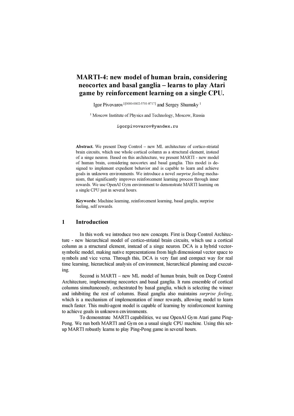 We present Deep Control - new ML architecture of cortico-striatal brain circuits, which use whole cortical column as a structural element, instead of a singe neuron. Based on this architecture, we present MARTI - new model of human brain, considering neocortex and basal ganglia. This model is de-signed to implement expedient behavior and is capable to learn and achieve goals in unknown environments. We introduce a novel surprise feeling mechanism, that significantly improves reinforcement learning process through inner rewards. We use OpenAI Gym environment to demonstrate MARTI learning on a single CPU just in several hours.