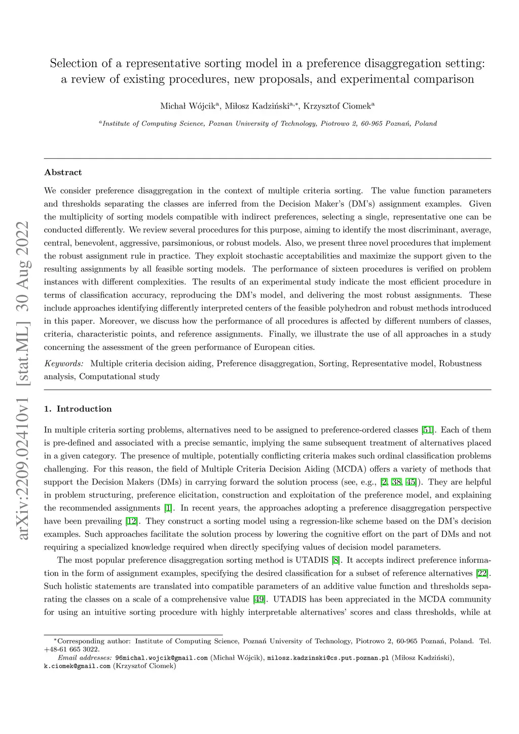 We consider preference disaggregation in the context of multiple criteria sorting. The value function parameters and thresholds separating the classes are inferred from the Decision Maker's (DM's) assignment examples. Given the multiplicity of sorting models compatible with indirect preferences, selecting a single, representative one can be conducted differently. We review several procedures for this purpose, aiming to identify the most discriminant, average, central, benevolent, aggressive, parsimonious, or robust models. Also, we present three novel procedures that implement the robust assignment rule in practice. They exploit stochastic acceptabilities and maximize the support given to the resulting assignments by all feasible sorting models. The performance of sixteen procedures is verified on problem instances with different complexities. The results of an experimental study indicate the most efficient procedure in terms of classification accuracy, reproducing the DM's model, and delivering the most robust assignments. These include approaches identifying differently interpreted centers of the feasible polyhedron and robust methods introduced in this paper. Moreover, we discuss how the performance of all procedures is affected by different numbers of classes, criteria, characteristic points, and reference assignments. Finally, we illustrate the use of all approaches in a study concerning the assessment of the green performance of European cities.