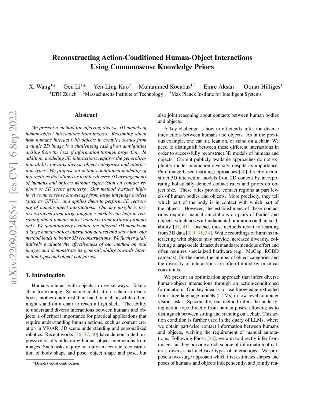 We present a method for inferring diverse 3D models of human-object interactions from images. Reasoning about how humans interact with objects in complex scenes from a single 2D image is a challenging task given ambiguities arising from the loss of information through projection. In addition, modeling 3D interactions requires the generalization ability towards diverse object categories and interaction types. We propose an action-conditioned modeling of interactions that allows us to infer diverse 3D arrangements of humans and objects without supervision on contact regions or 3D scene geometry. Our method extracts high-level commonsense knowledge from large language models (such as GPT-3), and applies them to perform 3D reasoning of human-object interactions. Our key insight is priors extracted from large language models can help in reasoning about human-object contacts from textural prompts only. We quantitatively evaluate the inferred 3D models on a large human-object interaction dataset and show how our method leads to better 3D reconstructions. We further qualitatively evaluate the effectiveness of our method on real images and demonstrate its generalizability towards interaction types and object categories.