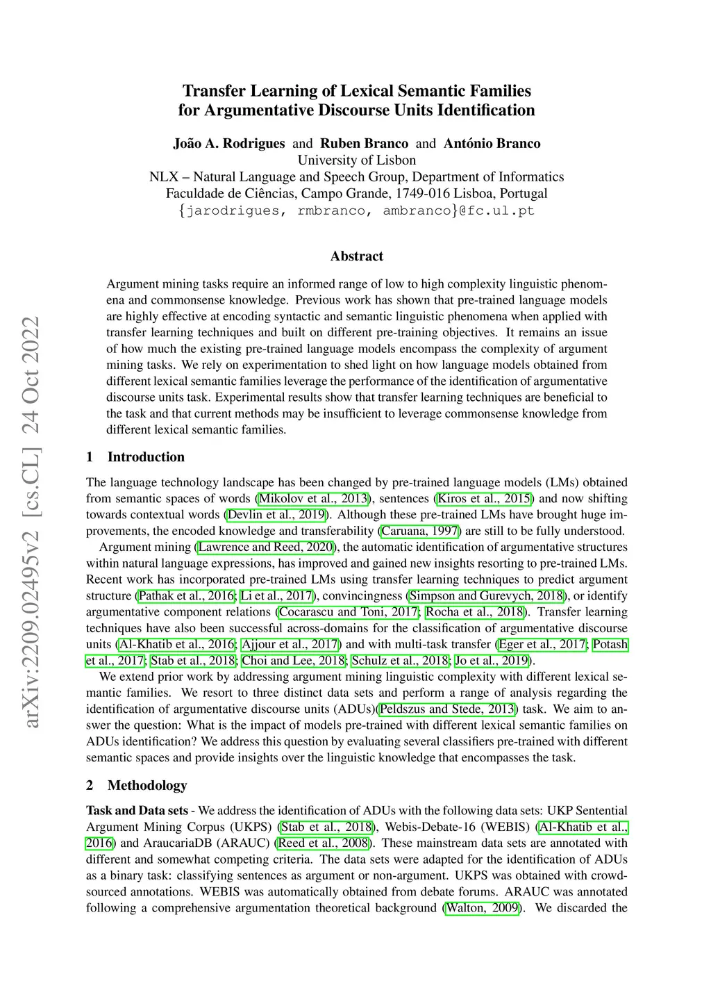 Argument mining tasks require an informed range of low to high complexity linguistic phenomena and commonsense knowledge. Previous work has shown that pre-trained language models are highly effective at encoding syntactic and semantic linguistic phenomena when applied with transfer learning techniques and built on different pre-training objectives. It remains an issue of how much the existing pre-trained language models encompass the complexity of argument mining tasks. We rely on experimentation to shed light on how language models obtained from different lexical semantic families leverage the performance of the identification of argumentative discourse units task. Experimental results show that transfer learning techniques are beneficial to the task and that current methods may be insufficient to leverage commonsense knowledge from different lexical semantic families.