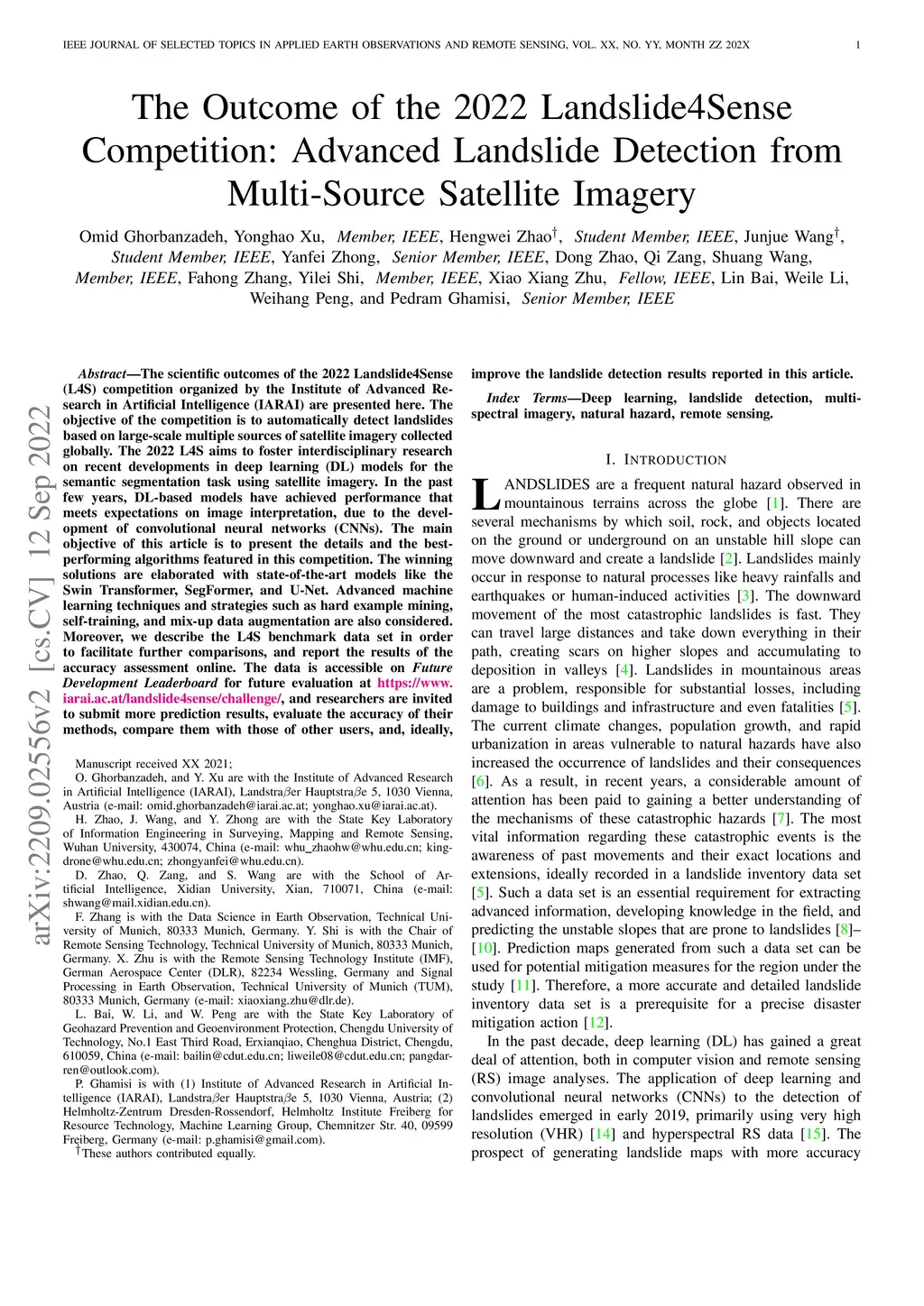The scientific outcomes of the 2022 Landslide4Sense (L4S) competition organized by the Institute of Advanced Research in Artificial Intelligence (IARAI) are presented here. The objective of the competition is to automatically detect landslides based on large-scale multiple sources of satellite imagery collected globally. The 2022 L4S aims to foster interdisciplinary research on recent developments in deep learning (DL) models for the semantic segmentation task using satellite imagery. In the past few years, DL-based models have achieved performance that meets expectations on image interpretation, due to the development of convolutional neural networks (CNNs). The main objective of this article is to present the details and the best-performing algorithms featured in this competition. The winning solutions are elaborated with state-of-the-art models like the Swin Transformer, SegFormer, and U-Net. Advanced machine learning techniques and strategies such as hard example mining, self-training, and mix-up data augmentation are also considered. Moreover, we describe the L4S benchmark data set in order to facilitate further comparisons, and report the results of the accuracy assessment online. The data is accessible on \textit{Future Development Leaderboard} for future evaluation at \url{https://www.iarai.ac.at/landslide4sense/challenge/}, and researchers are invited to submit more prediction results, evaluate the accuracy of their methods, compare them with those of other users, and, ideally, improve the landslide detection results reported in this article.