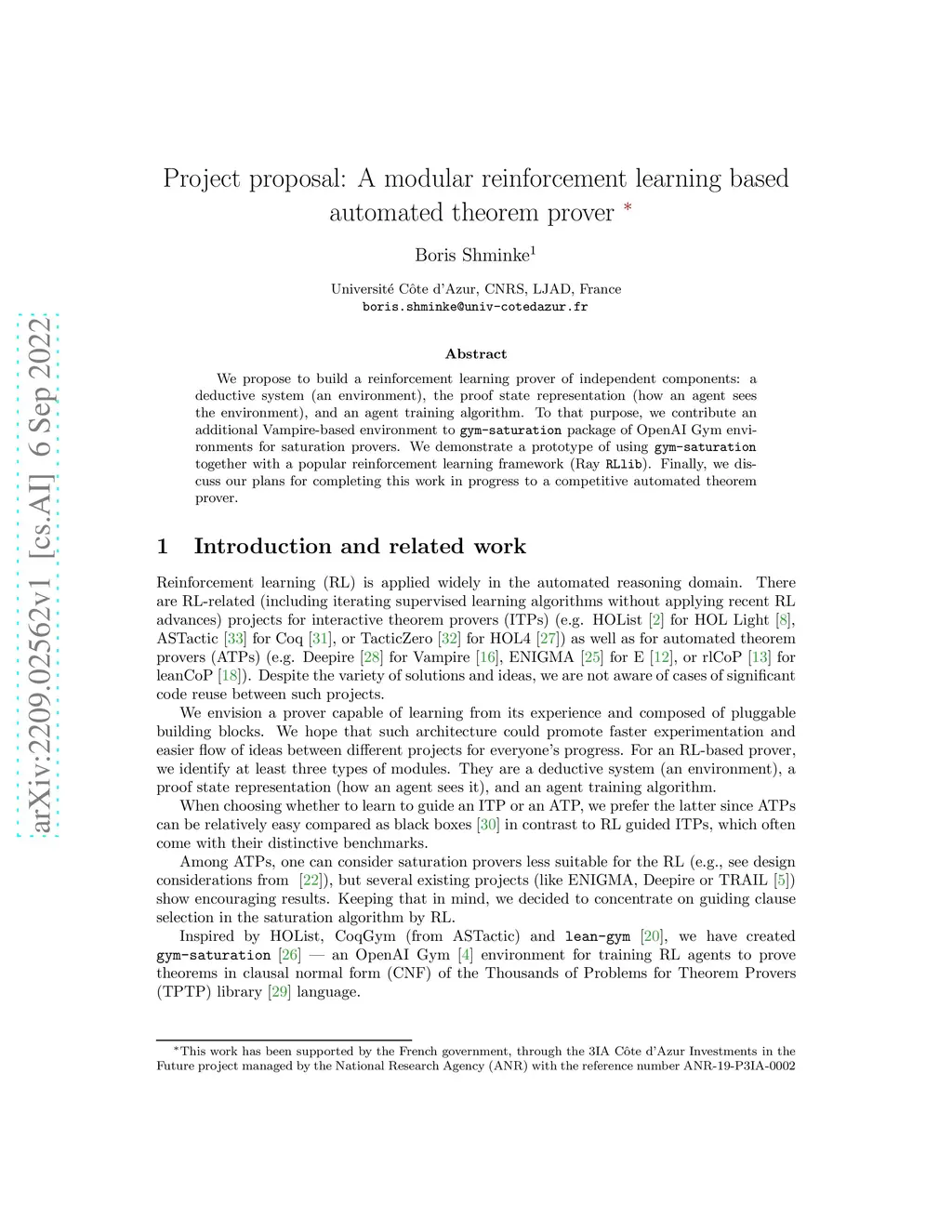 We propose to build a reinforcement learning prover of independent components: a deductive system (an environment), the proof state representation (how an agent sees the environment), and an agent training algorithm. To that purpose, we contribute an additional Vampire-based environment to package of OpenAI Gym environments for saturation provers. We demonstrate a prototype of using together with a popular reinforcement learning framework (Ray ). Finally, we discuss our plans for completing this work in progress to a competitive automated theorem prover.