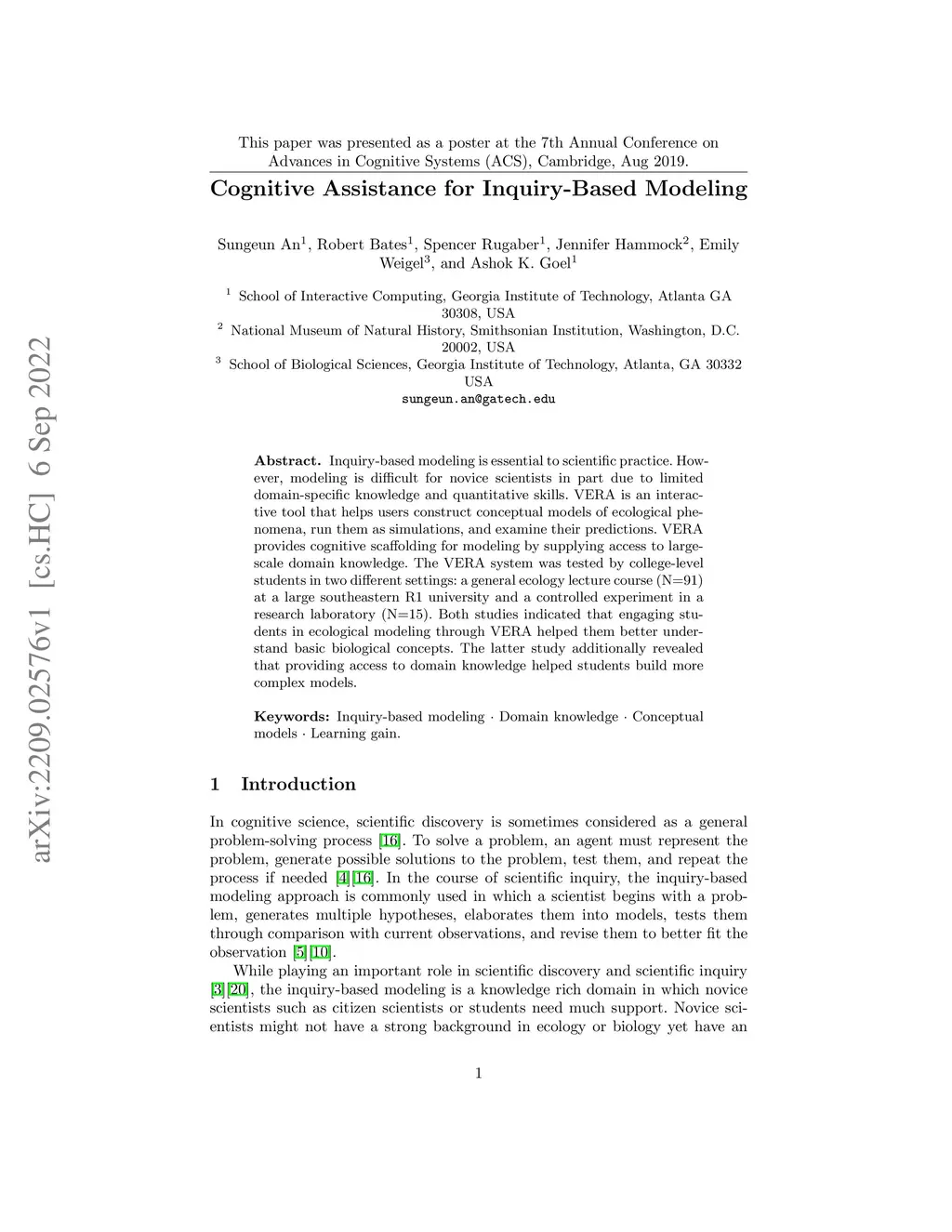 Inquiry-based modeling is essential to scientific practice. However, modeling is difficult for novice scientists in part due to limited domain-specific knowledge and quantitative skills. VERA is an interactive tool that helps users construct conceptual models of ecological phenomena, run them as simulations, and examine their predictions. VERA provides cognitive scaffolding for modeling by supplying access to large-scale domain knowledge. The VERA system was tested by college-level students in two different settings: a general ecology lecture course (N=91) at a large southeastern R1 university and a controlled experiment in a research laboratory (N=15). Both studies indicated that engaging students in ecological modeling through VERA helped them better understand basic biological concepts. The latter study additionally revealed that providing access to domain knowledge helped students build more complex models.