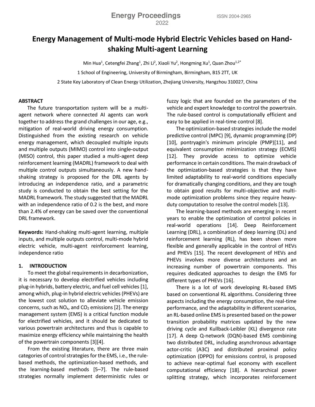 The future transportation system will be a multi-agent network where connected AI agents can work together to address the grand challenges in our age, e.g., mitigation of real-world driving energy consumption. Distinguished from the existing research on vehicle energy management, which decoupled multiple inputs and multiple outputs (MIMO) control into single-output(MISO) control, this paper studied a multi-agent deep reinforcement learning (MADRL) framework to deal with multiple control outputs simultaneously. A new hand-shaking strategy is proposed for the DRL agents by introducing an independence ratio, and a parametric study is conducted to obtain the best setting for the MADRL framework. The study suggested that the MADRL with an independence ratio of 0.2 is the best, and more than 2.4% of energy can be saved over the conventional DRL framework.