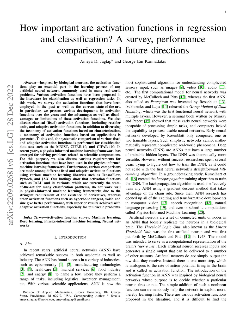 Inspired by biological neurons, the activation functions play an essential part in the learning process of any artificial neural network commonly used in many real-world problems. Various activation functions have been proposed in the literature for classification as well as regression tasks. In this work, we survey the activation functions that have been employed in the past as well as the current state-of-the-art. In particular, we present various developments in activation functions over the years and the advantages as well as disadvantages or limitations of these activation functions. We also discuss classical (fixed) activation functions, including rectifier units, and adaptive activation functions. In addition to discussing the taxonomy of activation functions based on characterization, a taxonomy of activation functions based on applications is presented. To this end, the systematic comparison of various fixed and adaptive activation functions is performed for classification data sets such as the MNIST, CIFAR-10, and CIFAR- 100. In recent years, a physics-informed machine learning framework has emerged for solving problems related to scientific computations. For this purpose, we also discuss various requirements for activation functions that have been used in the physics-informed machine learning framework. Furthermore, various comparisons are made among different fixed and adaptive activation functions using various machine learning libraries such as TensorFlow, Pytorch, and JAX.