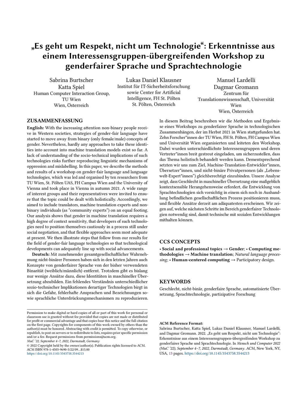 With the increasing attention non-binary people receive in Western societies, strategies of gender-fair language have started to move away from binary (only female/male) concepts of gender. Nevertheless, hardly any approaches to take these identities into account into machine translation models exist so far. A lack of understanding of the socio-technical implications of such technologies risks further reproducing linguistic mechanisms of oppression and mislabelling. In this paper, we describe the methods and results of a workshop on gender-fair language and language technologies, which was led and organised by ten researchers from TU Wien, St. P\"olten UAS, FH Campus Wien and the University of Vienna and took place in Vienna in autumn 2021. A wide range of interest groups and their representatives were invited to ensure that the topic could be dealt with holistically. Accordingly, we aimed to include translators, machine translation experts and non-binary individuals (as "community experts") on an equal footing. Our analysis shows that gender in machine translation requires a high degree of context sensitivity, that developers of such technologies need to position themselves cautiously in a process still under social negotiation, and that flexible approaches seem most adequate at present. We then illustrate steps that follow from our results for the field of gender-fair language technologies so that technological developments can adequately line up with social advancements. ---- Mit zunehmender gesamtgesellschaftlicher Wahrnehmung nicht-bin\"arer Personen haben sich in den letzten Jahren auch Konzepte von genderfairer Sprache von der bisher verwendeten Binarit\"at (weiblich/m\"annlich) entfernt. Trotzdem gibt es bislang nur wenige Ans\"atze dazu, diese Identit\"aten in maschineller \"Ubersetzung abzubilden. Ein fehlendes Verst\"andnis unterschiedlicher sozio-technischer Implikationen derartiger Technologien birgt in sich die Gefahr, fehlerhafte Ansprachen und Bezeichnungen sowie sprachliche Unterdr\"uckungsmechanismen zu reproduzieren. In diesem Beitrag beschreiben wir die Methoden und Ergebnisse eines Workshops zu genderfairer Sprache in technologischen Zusammenh\"angen, der im Herbst 2021 in Wien stattgefunden hat. Zehn Forscher*innen der TU Wien, FH St. P\"olten, FH Campus Wien und Universit\"at Wien organisierten und leiteten den Workshop. Dabei wurden unterschiedlichste Interessensgruppen und deren Vertreter*innen breit gestreut eingeladen, um sicherzustellen, dass das Thema holistisch behandelt werden kann. Dementsprechend setzten wir uns zum Ziel, Machine-Translation-Entwickler*innen, \"Ubersetzer*innen, und nicht-bin\"are Privatpersonen (als "Lebenswelt-Expert*innen") gleichberechtigt einzubinden. Unsere Analyse zeigt, dass Geschlecht in maschineller \"Ubersetzung eine ma\ss{}geblich kontextsensible Herangehensweise erfordert, die Entwicklung von Sprachtechnologien sich vorsichtig in einem sich noch in Aushandlung befindlichen gesellschaftlichen Prozess positionieren muss, und flexible Ans\"atze derzeit am ad\"aquatesten erscheinen. Wir zeigen auf, welche n\"achsten Schritte im Bereich genderfairer Technologien notwendig sind, damit technische mit sozialen Entwicklungen mithalten k\"onnen.