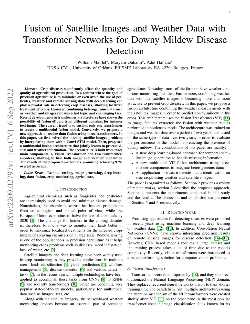 Crop diseases significantly affect the quantity and quality of agricultural production. In a context where the goal of precision agriculture is to minimize or even avoid the use of pesticides, weather and remote sensing data with deep learning can play a pivotal role in detecting crop diseases, allowing localized treatment of crops. However, combining heterogeneous data such as weather and images remains a hot topic and challenging task. Recent developments in transformer architectures have shown the possibility of fusion of data from different domains, for instance text-image. The current trend is to custom only one transformer to create a multimodal fusion model. Conversely, we propose a new approach to realize data fusion using three transformers. In this paper, we first solved the missing satellite images problem, by interpolating them with a ConvLSTM model. Then, proposed a multimodal fusion architecture that jointly learns to process visual and weather information. The architecture is built from three main components, a Vision Transformer and two transformer-encoders, allowing to fuse both image and weather modalities. The results of the proposed method are promising achieving 97\% overall accuracy.