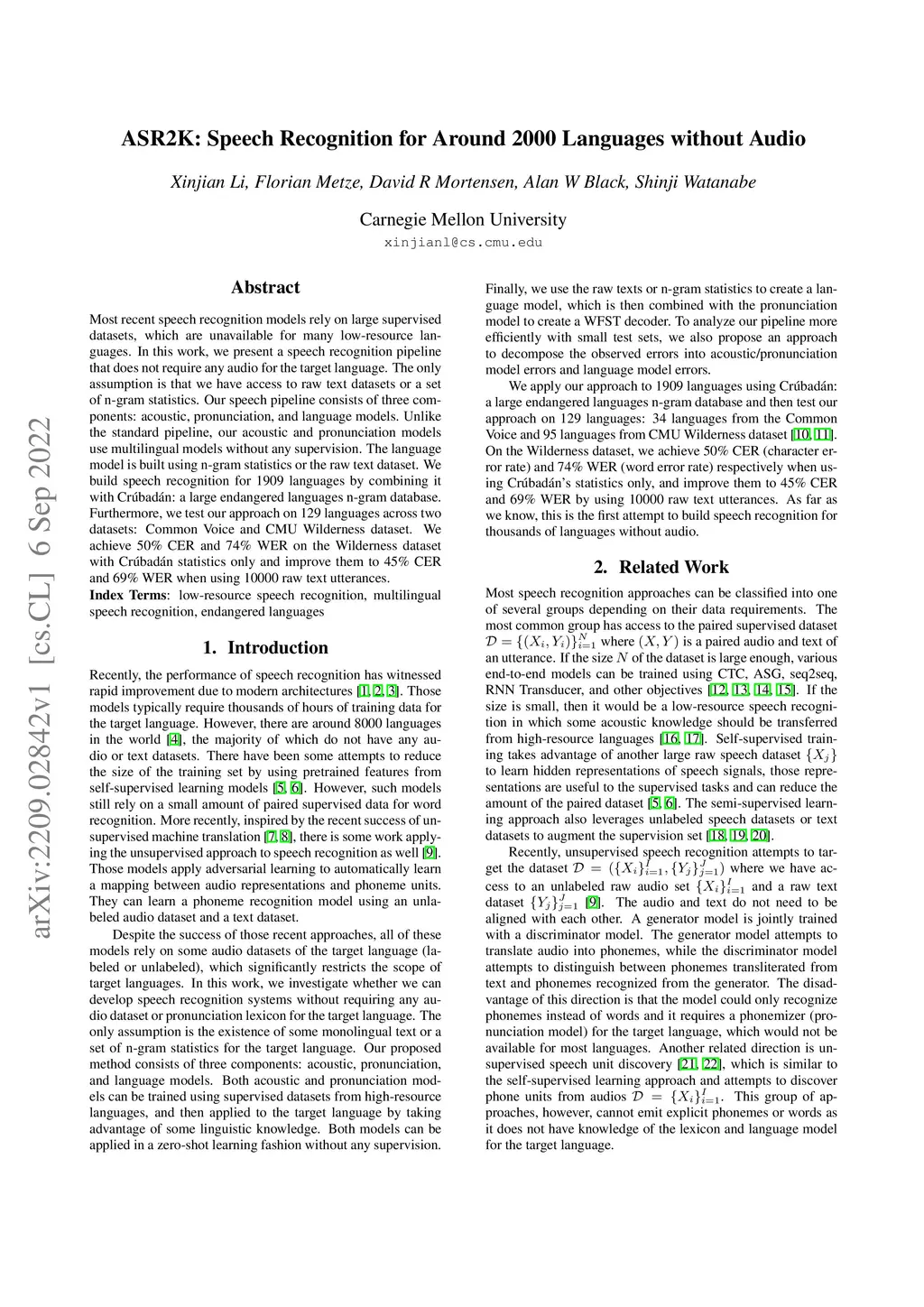 Most recent speech recognition models rely on large supervised datasets, which are unavailable for many low-resource languages. In this work, we present a speech recognition pipeline that does not require any audio for the target language. The only assumption is that we have access to raw text datasets or a set of n-gram statistics. Our speech pipeline consists of three components: acoustic, pronunciation, and language models. Unlike the standard pipeline, our acoustic and pronunciation models use multilingual models without any supervision. The language model is built using n-gram statistics or the raw text dataset. We build speech recognition for 1909 languages by combining it with Crubadan: a large endangered languages n-gram database. Furthermore, we test our approach on 129 languages across two datasets: Common Voice and CMU Wilderness dataset. We achieve 50% CER and 74% WER on the Wilderness dataset with Crubadan statistics only and improve them to 45% CER and 69% WER when using 10000 raw text utterances.