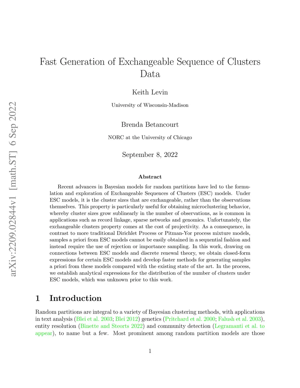 Recent advances in Bayesian models for random partitions have led to the formulation and exploration of Exchangeable Sequences of Clusters (ESC) models. Under ESC models, it is the cluster sizes that are exchangeable, rather than the observations themselves. This property is particularly useful for obtaining microclustering behavior, whereby cluster sizes grow sublinearly in the number of observations, as is common in applications such as record linkage, sparse networks and genomics. Unfortunately, the exchangeable clusters property comes at the cost of projectivity. As a consequence, in contrast to more traditional Dirichlet Process or Pitman-Yor process mixture models, samples a priori from ESC models cannot be easily obtained in a sequential fashion and instead require the use of rejection or importance sampling. In this work, drawing on connections between ESC models and discrete renewal theory, we obtain closed-form expressions for certain ESC models and develop faster methods for generating samples a priori from these models compared with the existing state of the art. In the process, we establish analytical expressions for the distribution of the number of clusters under ESC models, which was unknown prior to this work.