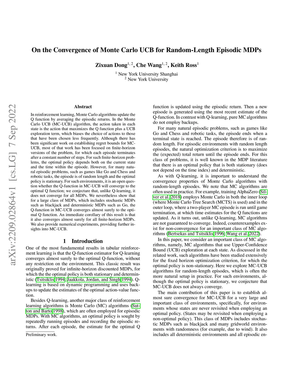 In reinforcement learning, Monte Carlo algorithms update the Q function by averaging the episodic returns. In the Monte Carlo UCB (MC-UCB) algorithm, the action taken in each state is the action that maximizes the Q function plus an Upper Confidence Bounds (UCB) exploration term, which biases the choice of actions to those that have been chosen less frequently. Although there has been significant work on establishing regret bounds for MC-UCB, most of that work has been focused on finite-horizon versions of the problem, for which each episode terminates after a constant number of steps. For such finite-horizon problems, the optimal policy depends both on the current state and the time within the episode. However, for many natural episodic problems, such as games like Go and Chess and robotic tasks, the episode is of random length and the optimal policy is stationary. For such environments, it is an open question whether the Q-function in MC-UCB will converge to the optimal Q function; we conjecture that, unlike Q-learning, it does not converge for all MDPs. We nevertheless show that for a large class of MDPs, which includes stochastic MDPs such as blackjack and deterministic MDPs such as Go, the Q function in MC-UCB converges almost surely to the optimal Q function. An immediate corollary of this result is that it also converges almost surely for all finite-horizon MDPs. We also provide numerical experiments, providing further insights into MC-UCB.