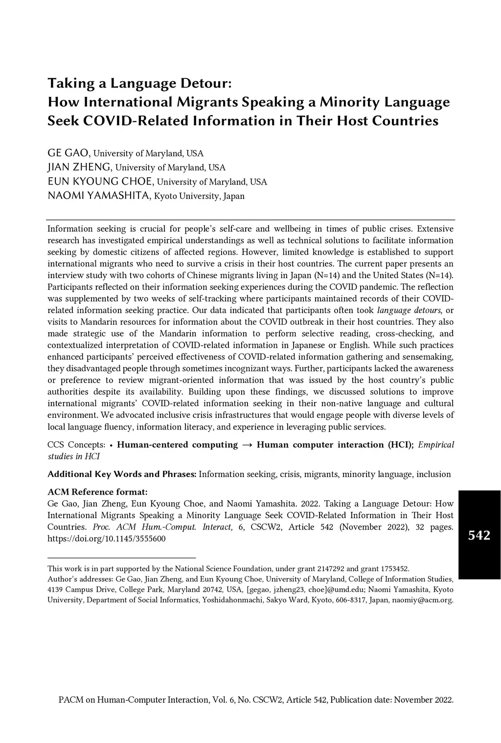 Information seeking is crucial for people's self-care and wellbeing in times of public crises. Extensive research has investigated empirical understandings as well as technical solutions to facilitate information seeking by domestic citizens of affected regions. However, limited knowledge is established to support international migrants who need to survive a crisis in their host countries. The current paper presents an interview study with two cohorts of Chinese migrants living in Japan (N=14) and the United States (N=14). Participants reflected on their information seeking experiences during the COVID pandemic. The reflection was supplemented by two weeks of self-tracking where participants maintained records of their COVIDrelated information seeking practice. Our data indicated that participants often took language detours, or visits to Mandarin resources for information about the COVID outbreak in their host countries. They also made strategic use of the Mandarin information to perform selective reading, cross-checking, and contextualized interpretation of COVID-related information in Japanese or English. While such practices enhanced participants' perceived effectiveness of COVID-related information gathering and sensemaking, they disadvantaged people through sometimes incognizant ways. Further, participants lacked the awareness or preference to review migrant-oriented information that was issued by the host country's public authorities despite its availability. Building upon these findings, we discussed solutions to improve international migrants' COVID-related information seeking in their non-native language and cultural environment. We advocated inclusive crisis infrastructures that would engage people with diverse levels of local language fluency, information literacy, and experience in leveraging public services.