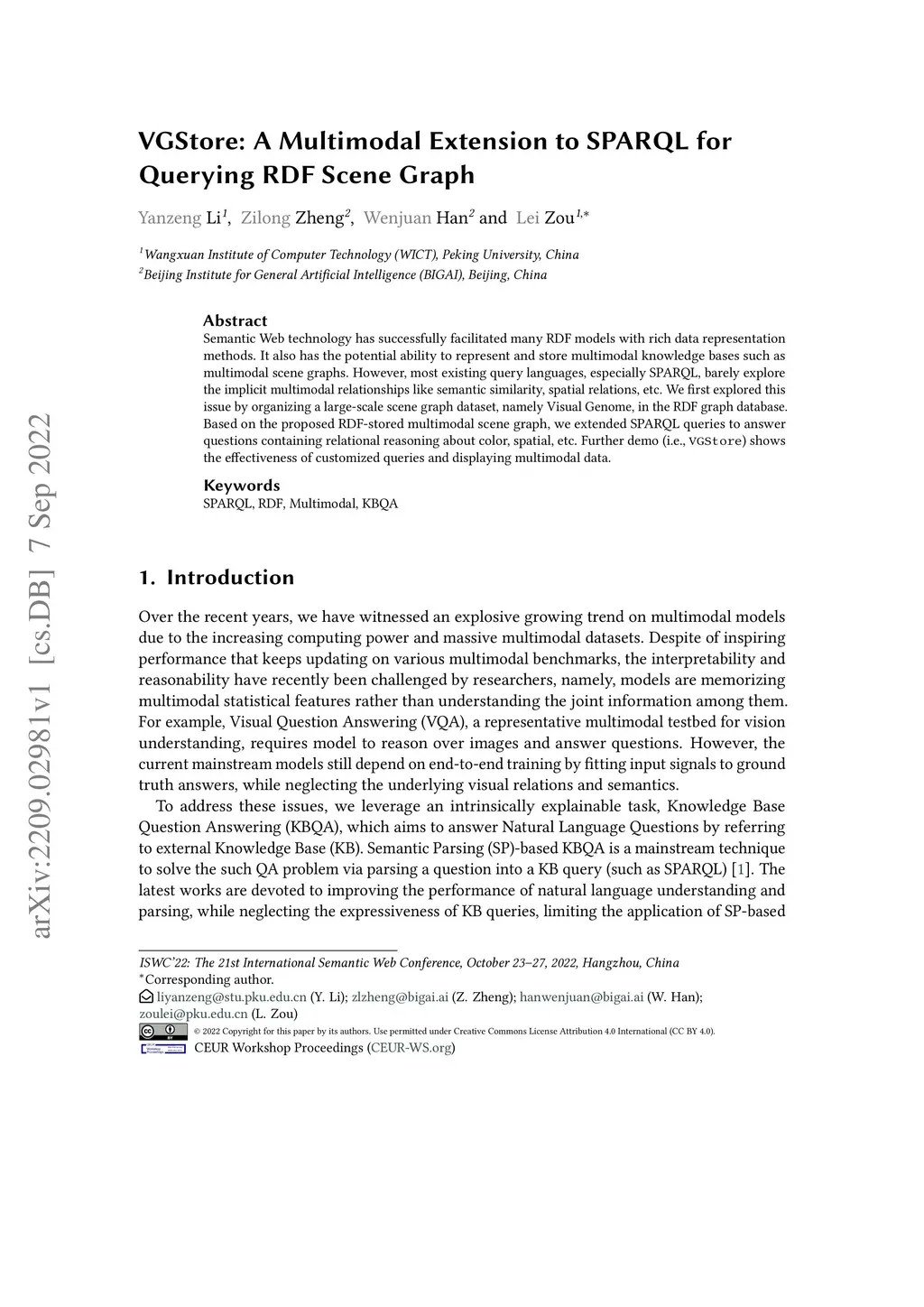 Semantic Web technology has successfully facilitated many RDF models with rich data representation methods. It also has the potential ability to represent and store multimodal knowledge bases such as multimodal scene graphs. However, most existing query languages, especially SPARQL, barely explore the implicit multimodal relationships like semantic similarity, spatial relations, etc. We first explored this issue by organizing a large-scale scene graph dataset, namely Visual Genome, in the RDF graph database. Based on the proposed RDF-stored multimodal scene graph, we extended SPARQL queries to answer questions containing relational reasoning about color, spatial, etc. Further demo (i.e., VGStore) shows the effectiveness of customized queries and displaying multimodal data.