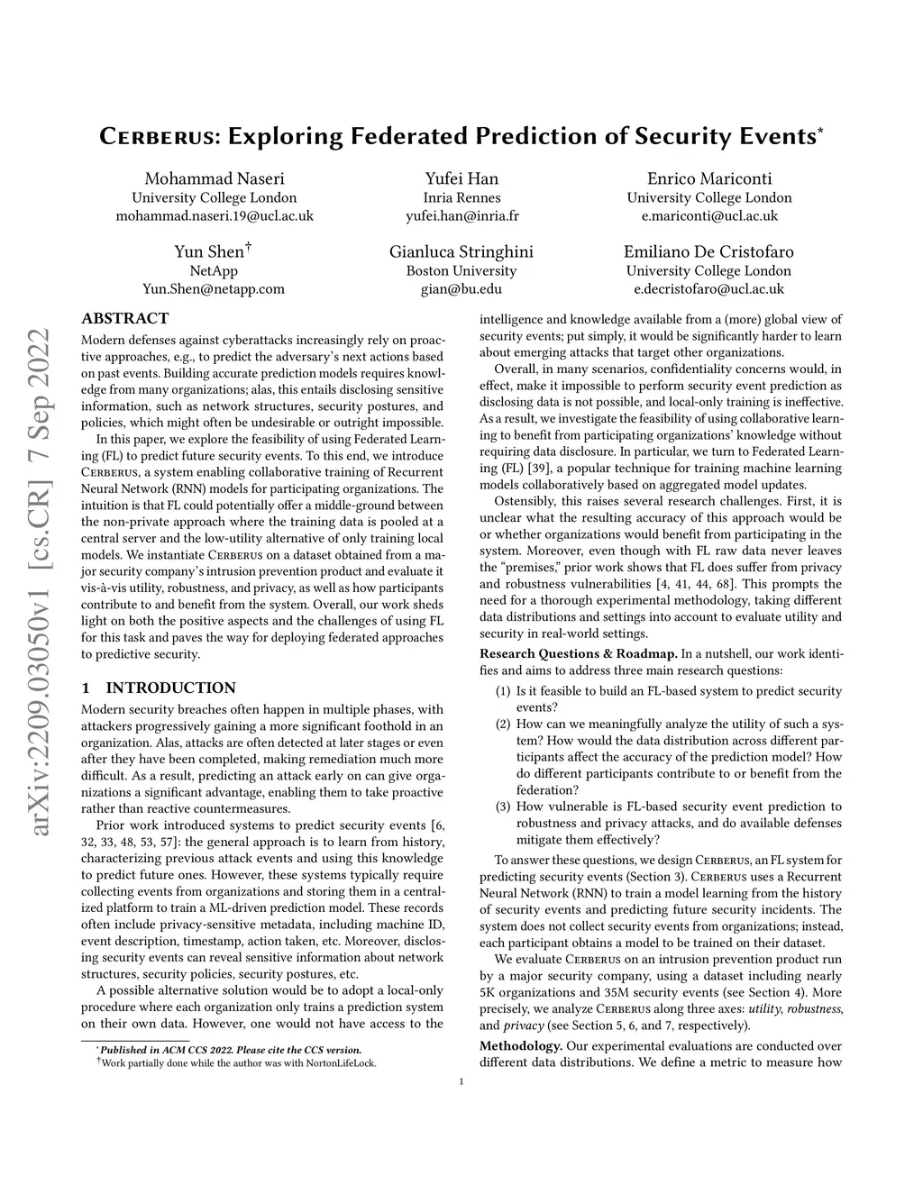 Cerberus: Exploring Federated Prediction of Security Events