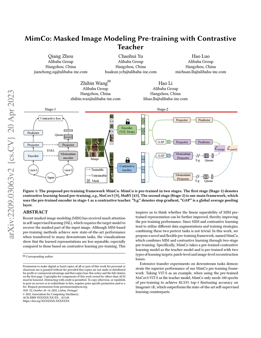 Recent masked image modeling (MIM) has received much attention in self-supervised learning (SSL), which requires the target model to recover the masked part of the input image. Although MIM-based pre-training methods achieve new state-of-the-art performance when transferred to many downstream tasks, the visualizations show that the learned representations are less separable, especially compared to those based on contrastive learning pre-training. This inspires us to think whether the linear separability of MIM pre-trained representation can be further improved, thereby improving the pre-training performance. Since MIM and contrastive learning tend to utilize different data augmentations and training strategies, combining these two pretext tasks is not trivial. In this work, we propose a novel and flexible pre-training framework, named MimCo, which combines MIM and contrastive learning through two-stage pre-training. Specifically, MimCo takes a pre-trained contrastive learning model as the teacher model and is pre-trained with two types of learning targets: patch-level and image-level reconstruction losses. Extensive transfer experiments on downstream tasks demonstrate the superior performance of our MimCo pre-training framework. Taking ViT-S as an example, when using the pre-trained MoCov3-ViT-S as the teacher model, MimCo only needs 100 epochs of pre-training to achieve 82.53% top-1 finetuning accuracy on Imagenet-1K, which outperforms the state-of-the-art self-supervised learning counterparts.