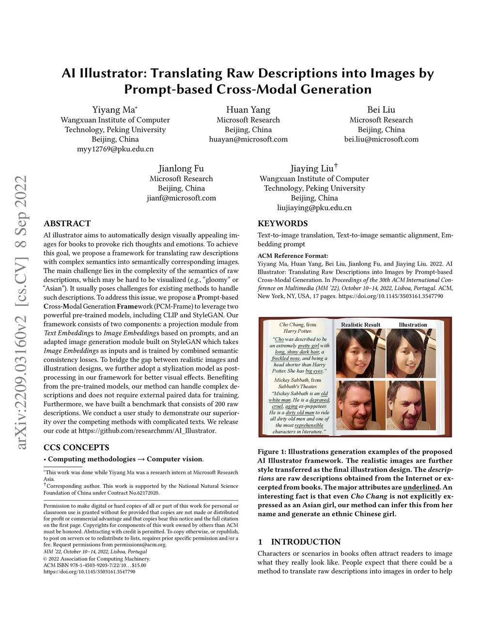 AI illustrator aims to automatically design visually appealing images for books to provoke rich thoughts and emotions. To achieve this goal, we propose a framework for translating raw descriptions with complex semantics into semantically corresponding images. The main challenge lies in the complexity of the semantics of raw descriptions, which may be hard to be visualized (e.g., "gloomy" or "Asian"). It usually poses challenges for existing methods to handle such descriptions. To address this issue, we propose a Prompt-based Cross-Modal Generation Framework (PCM-Frame) to leverage two powerful pre-trained models, including CLIP and StyleGAN. Our framework consists of two components: a projection module from Text Embeddings to Image Embeddings based on prompts, and an adapted image generation module built on StyleGAN which takes Image Embeddings as inputs and is trained by combined semantic consistency losses. To bridge the gap between realistic images and illustration designs, we further adopt a stylization model as post-processing in our framework for better visual effects. Benefiting from the pre-trained models, our method can handle complex descriptions and does not require external paired data for training. Furthermore, we have built a benchmark that consists of 200 raw descriptions. We conduct a user study to demonstrate our superiority over the competing methods with complicated texts. We release our code at https://github.com/researchmm/AI_Illustrator.