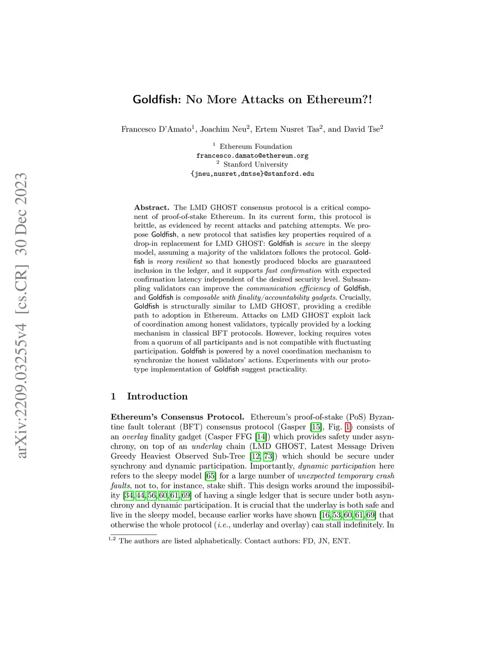 The LMD GHOST consensus protocol is a critical component of proof-of-stake Ethereum. In its current form, this protocol is brittle, as evidenced by recent attacks and patching attempts. We propose Goldfish, a new protocol that satisfies key properties required of a drop-in replacement for LMD GHOST: Goldfish is secure in the sleepy model, assuming a majority of the validators follows the protocol. Goldfish is reorg resilient so that honestly produced blocks are guaranteed inclusion in the ledger, and it supports fast confirmation with expected confirmation latency independent of the desired security level. Subsampling validators can improve the communication efficiency of Goldfish, and Goldfish is composable with finality/accountability gadgets. Crucially, Goldfish is structurally similar to LMD GHOST, providing a credible path to adoption in Ethereum. Attacks on LMD GHOST exploit lack of coordination among honest validators, typically provided by a locking mechanism in classical BFT protocols. However, locking requires votes from a quorum of all participants and is not compatible with fluctuating participation. Goldfish is powered by a novel coordination mechanism to synchronize the honest validators' actions. Experiments with our prototype implementation of Goldfish suggest practicality.