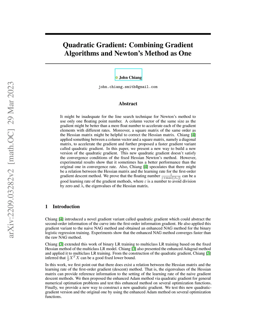 It might be inadequate for the line search technique for Newton's method to use only one floating point number. A column vector of the same size as the gradient might be better than a mere float number to accelerate each of the gradient elements with different rates. Moreover, a square matrix of the same order as the Hessian matrix might be helpful to correct the Hessian matrix. Chiang applied something between a column vector and a square matrix, namely a diagonal matrix, to accelerate the gradient and further proposed a faster gradient variant called quadratic gradient. In this paper, we present a new way to build a new version of the quadratic gradient. This new quadratic gradient doesn't satisfy the convergence conditions of the fixed Hessian Newton's method. However, experimental results show that it sometimes has a better performance than the original one in convergence rate. Also, Chiang speculates that there might be a relation between the Hessian matrix and the learning rate for the first-order gradient descent method. We prove that the floating number can be a good learning rate of the gradient methods, where is a number to avoid division by zero and the eigenvalues of the Hessian matrix.