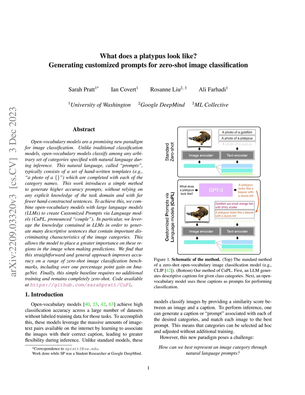 Open-vocabulary models are a promising new paradigm for image classification. Unlike traditional classification models, open-vocabulary models classify among any arbitrary set of categories specified with natural language during inference. This natural language, called "prompts", typically consists of a set of hand-written templates (e.g., "a photo of a {}") which are completed with each of the category names. This work introduces a simple method to generate higher accuracy prompts, without relying on any explicit knowledge of the task domain and with far fewer hand-constructed sentences. To achieve this, we combine open-vocabulary models with large language models (LLMs) to create Customized Prompts via Language models (CuPL, pronounced "couple"). In particular, we leverage the knowledge contained in LLMs in order to generate many descriptive sentences that contain important discriminating characteristics of the image categories. This allows the model to place a greater importance on these regions in the image when making predictions. We find that this straightforward and general approach improves accuracy on a range of zero-shot image classification benchmarks, including over one percentage point gain on ImageNet. Finally, this simple baseline requires no additional training and remains completely zero-shot. Code available at https://github.com/sarahpratt/CuPL.