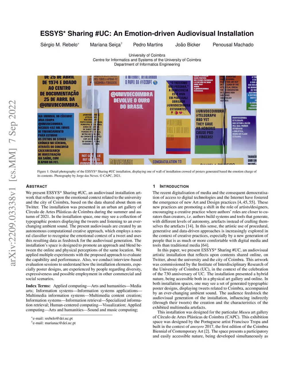 We present ESSYS* Sharing #UC, an audiovisual installation artwork that reflects upon the emotional context related to the university and the city of Coimbra, based on the data shared about them on Twitter. The installation was presented in an urban art gallery of C\írculo de Artes Pl\ásticas de Coimbra during the summer and autumn of 2021. In the installation space, one may see a collection of typographic posters displaying the tweets and listening to an ever-changing ambient sound. The present audiovisuals are created by an autonomous computational creative approach, which employs a neural classifier to recognize the emotional context of a tweet and uses this resulting data as feedstock for the audiovisual generation. The installation's space is designed to promote an approach and blend between the online and physical perceptions of the same location. We applied multiple experiments with the proposed approach to evaluate the capability and performance. Also, we conduct interview-based evaluation sessions to understand how the installation elements, especially poster designs, are experienced by people regarding diversity, expressiveness and possible employment in other commercial and social scenarios.