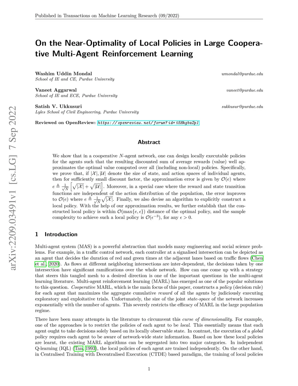 We show that in a cooperative -agent network, one can design locally executable policies for the agents such that the resulting discounted sum of average rewards (value) well approximates the optimal value computed over all (including non-local) policies. Specifically, we prove that, if denote the size of state, and action spaces of individual agents, then for sufficiently small discount factor, the approximation error is given by where . Moreover, in a special case where the reward and state transition functions are independent of the action distribution of the population, the error improves to where . Finally, we also devise an algorithm to explicitly construct a local policy. With the help of our approximation results, we further establish that the constructed local policy is within distance of the optimal policy, and the sample complexity to achieve such a local policy is , for any .